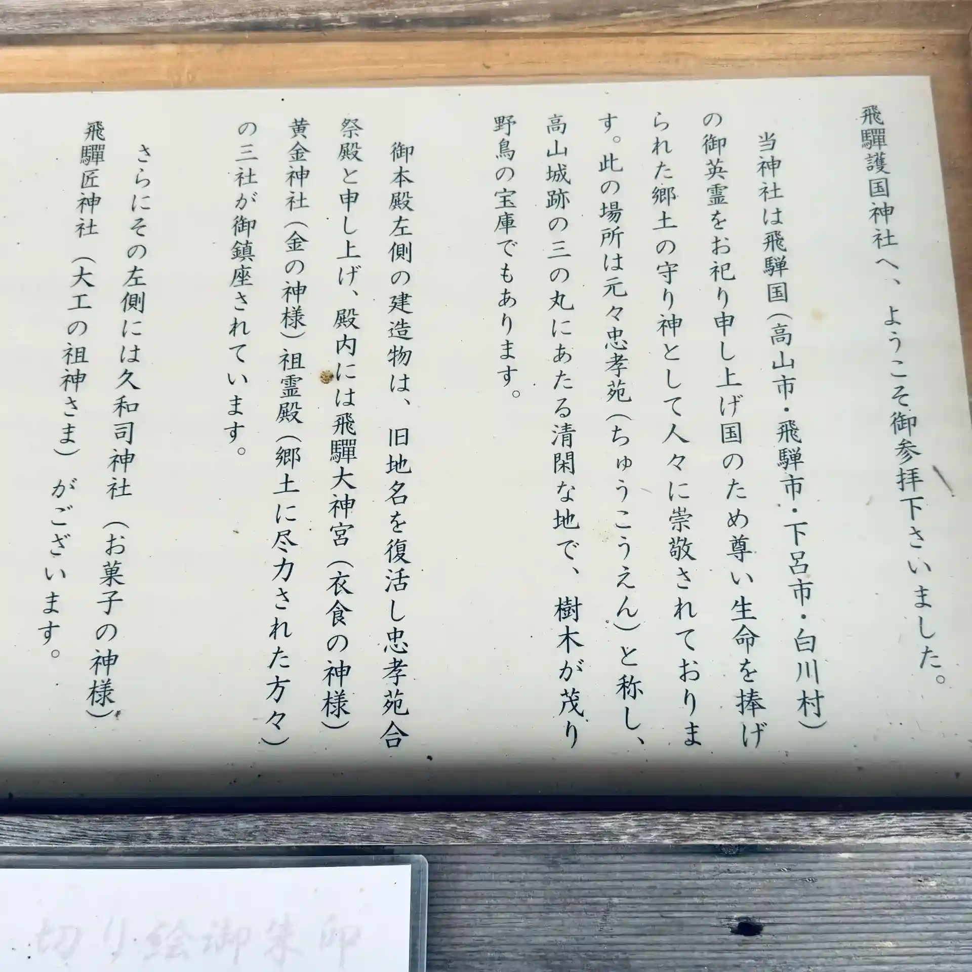 敷地内には、飛騨大神宮・黄金神社・祖霊殿・久和司神社・飛騨匠神社が御鎮座されています。