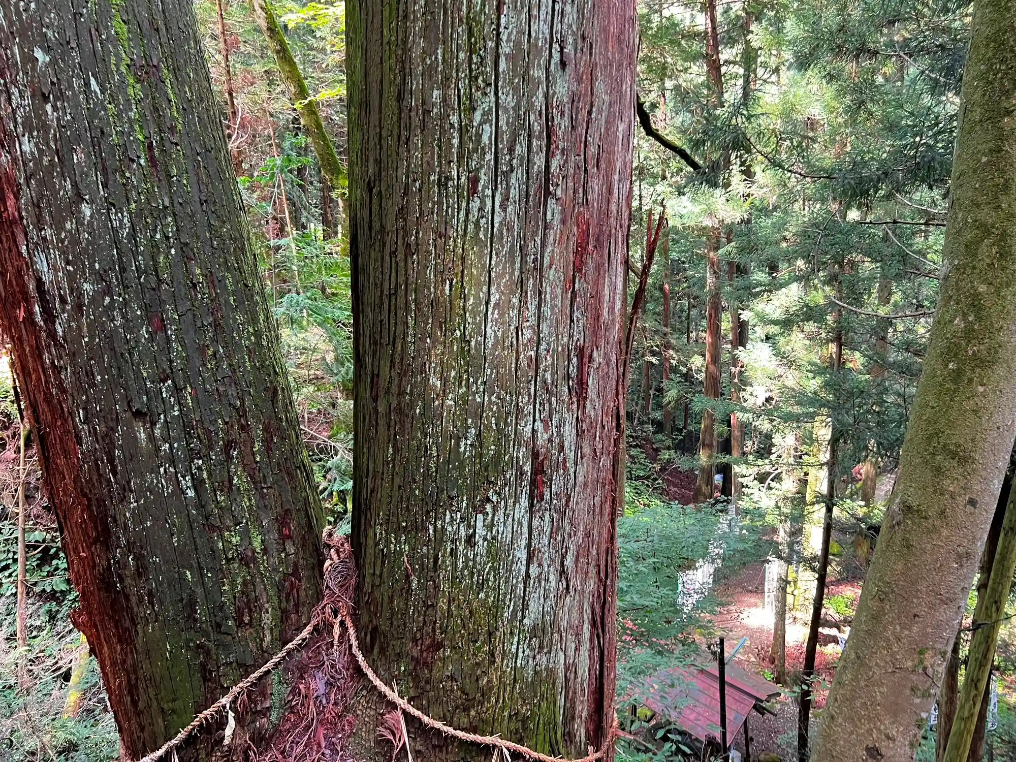 参道右側に現れる<夫婦杉>。ちゃんと注連縄が架かっている。