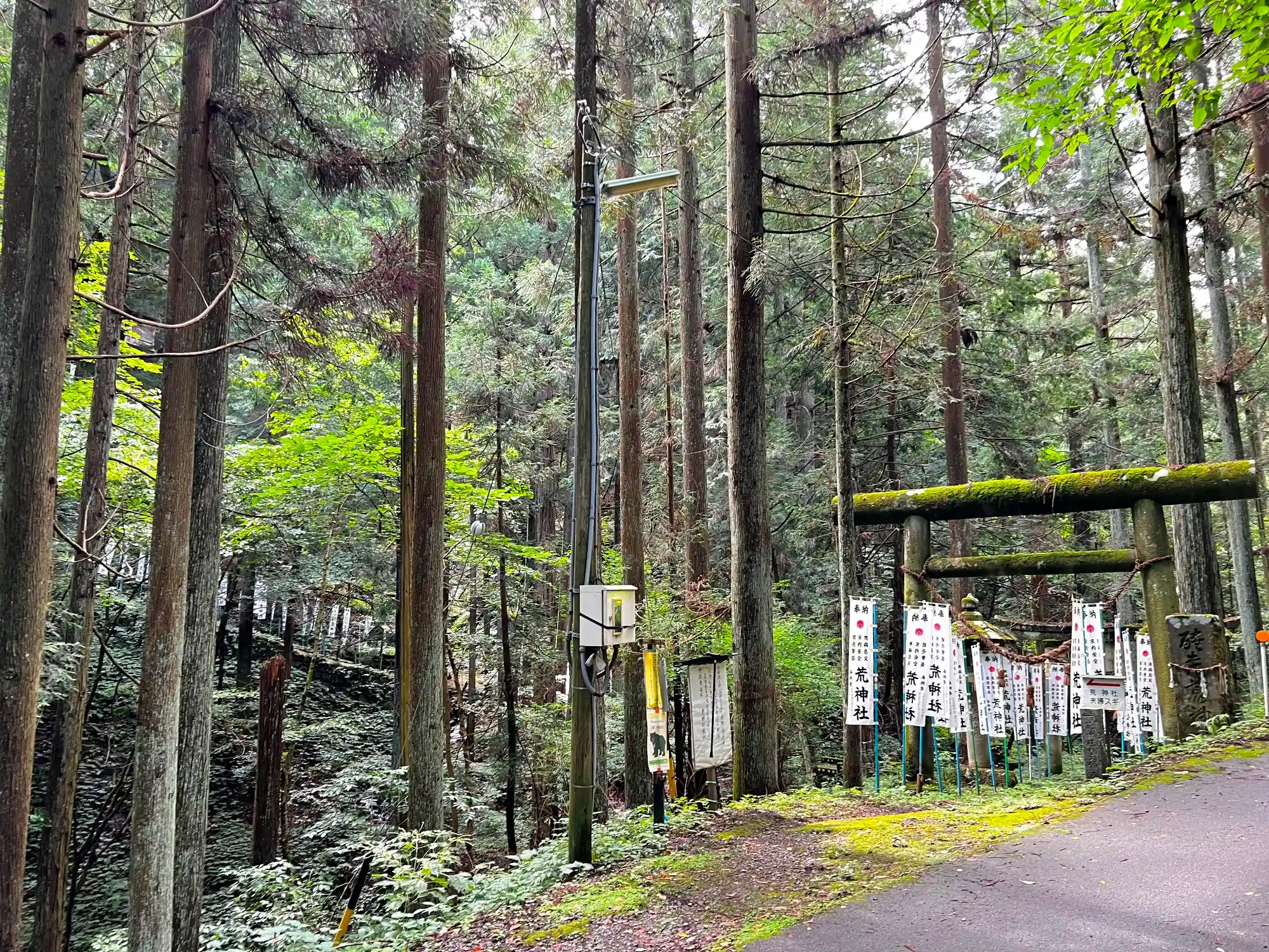当社は、JR高山本線・高山駅の南東4kmの山岳地帯の入口、長野県・木曽に抜ける国道361号線の近くにある。周囲に民家などはなく、人里離れた森の沢の両岸が境内になっている。入口の鳥居からだと、一度沢まで降りて橋を渡り、その後50mほど(たぶん)登ったところに社殿がある。参道に奉納旗がたくさん立っているので不安はないが、もし立っていなかったらサバイバル系神社になれている自分でもかなりビビりそうな造り。トータルでは現在でも篤い信仰に支えられている神社といえそう。