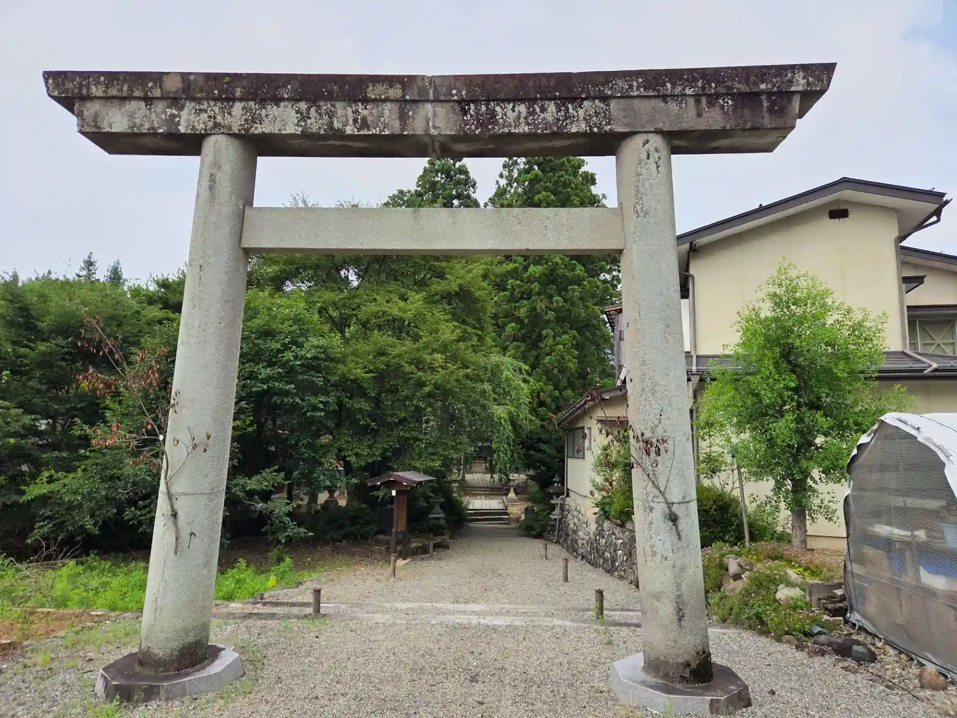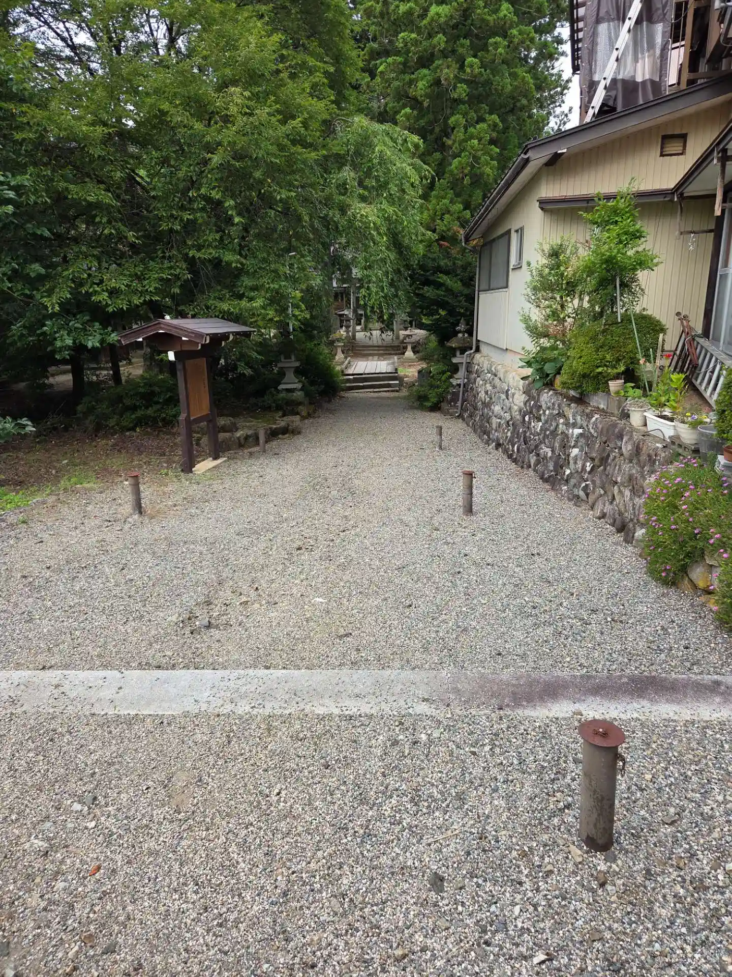 式内社「飛騨国大野郡 荏名神社」の論社ですが、衰退し所在不明となっていた神社です。文化12年(1815年)、高山の国学者田中大秀が、江名子町の稲置(いなき)の森にあった子安大明神(子安観音堂)を、「荏名」が「胞衣」(胎盤)と解されたためだとして式内・荏名神社に比定し、自らが神主となり荏名神社に改称して再興しました。自ら隠棲し荏野翁と称し本殿傍らに隠居所を建てて住んでいました。この田中大秀なる人物は、この後参拝する神社でもちょくちょく目にする人物です。こののち同様に衰退していた飛騨総社も再興しています。高山の神社を参拝するにあたり、最初の神社としてはふさわしいものになりました。