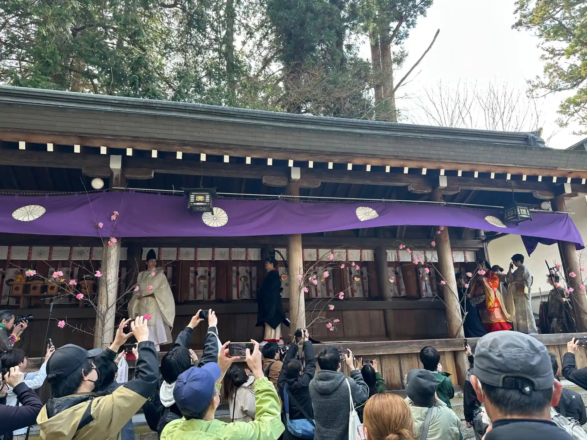 13時の出発に合わせて鳥居前に多くの人たちがカメラを構えて待っています。