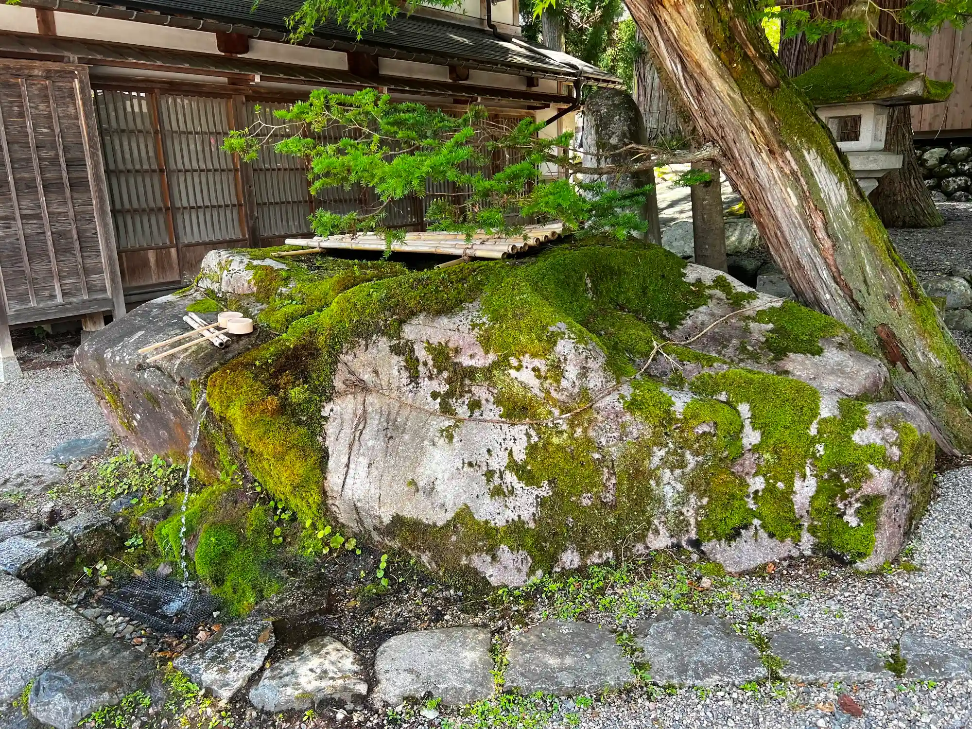 境内入口左手にある、大きな自然石の<手水盤>。