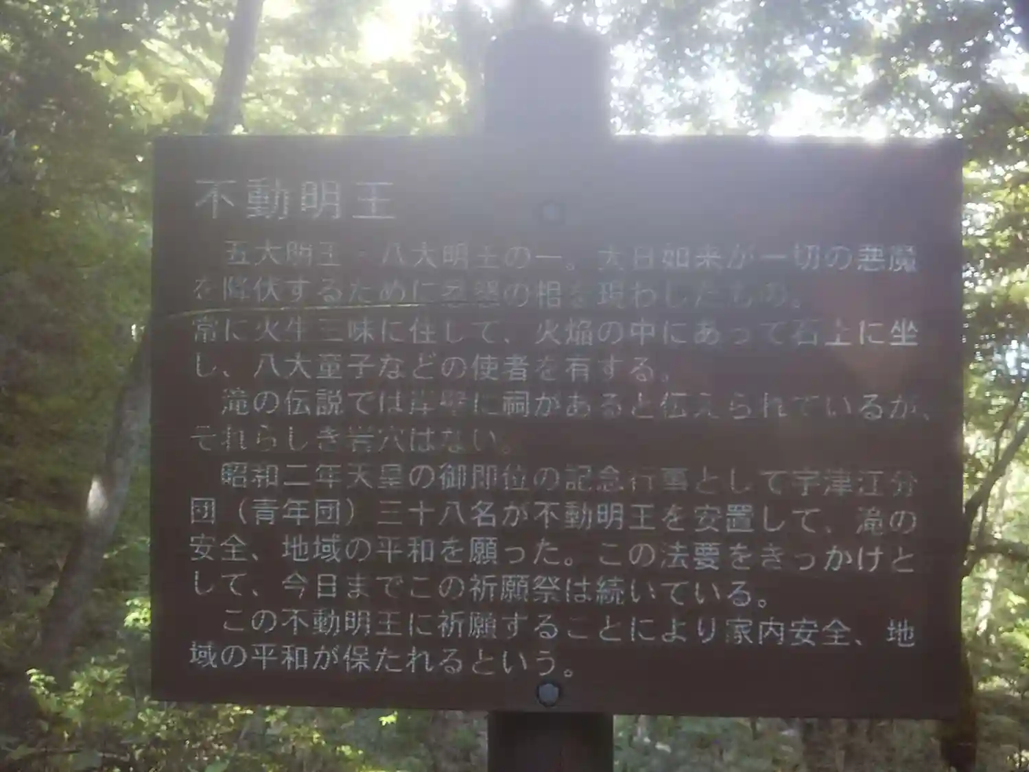 不動明王は昭和2年に天皇即位の記念行事として、地元青年団が安置したもの。地元にはよそ八(四十八?)という若者と大池の大蛇、そして大蛇を救った行者(不動尊の化身?)の伝説がある。