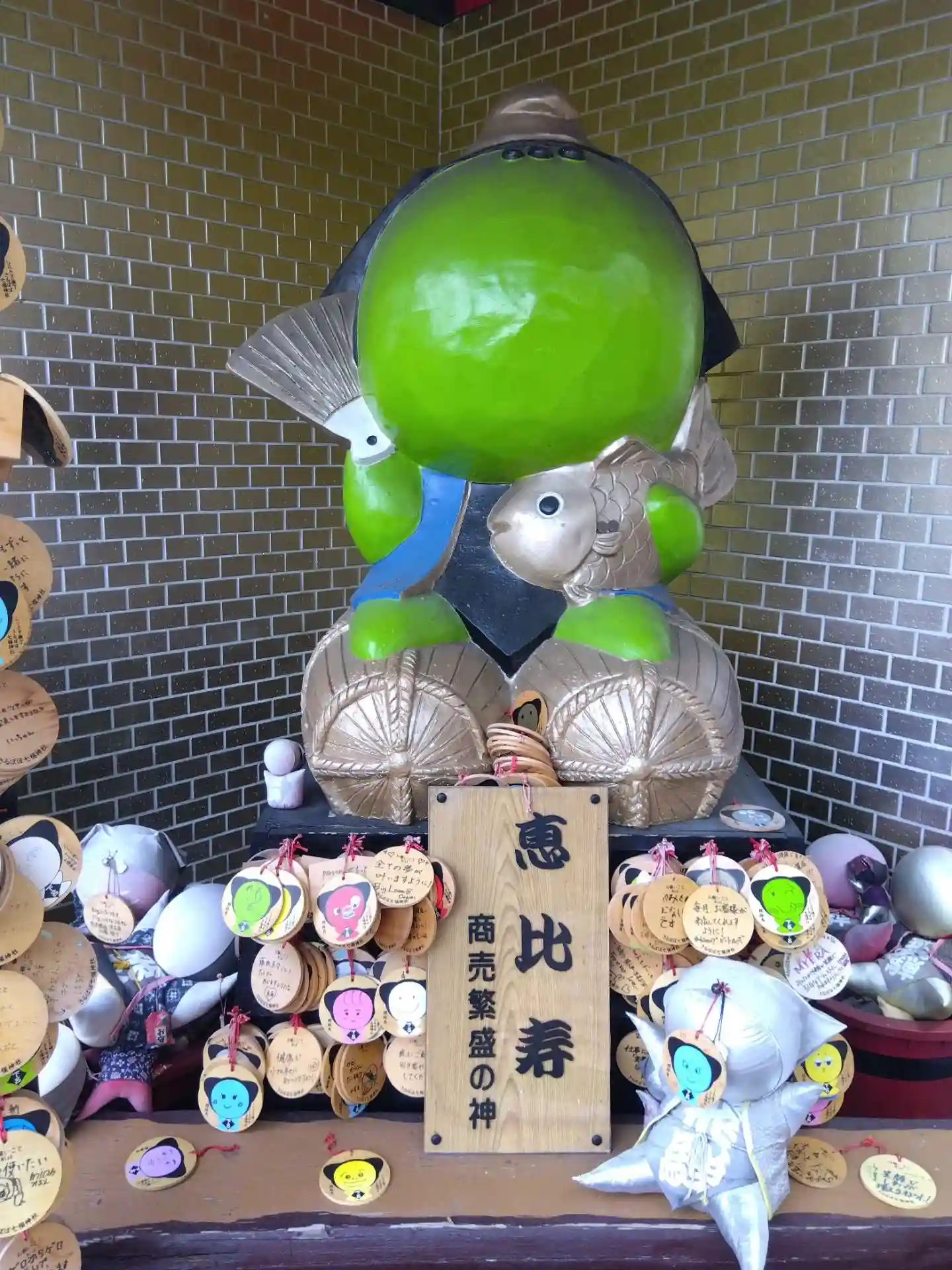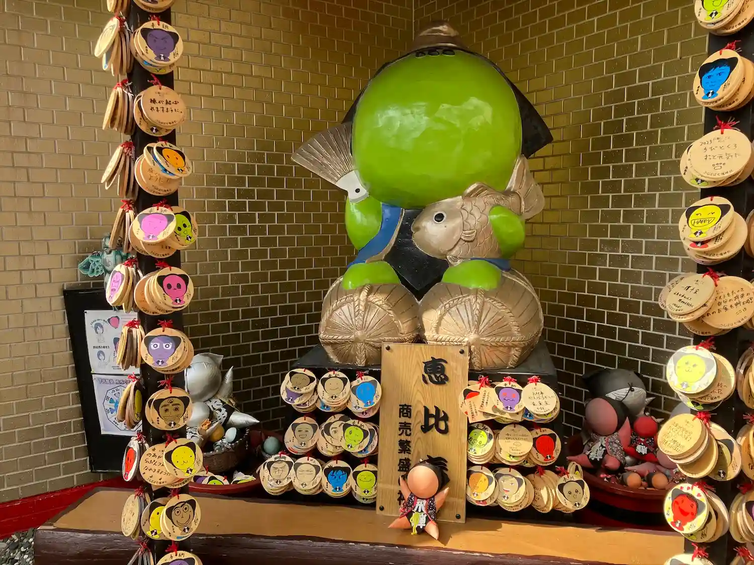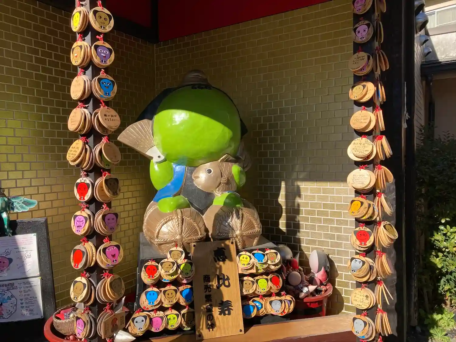 阿多野川北側の阿多野通り沿いにある「しらさぎ横丁」入ってすぐの場所にある、さるぼぼ七福神の「恵比寿」。このような大きな<さるぼぼ>が7色7体ある。