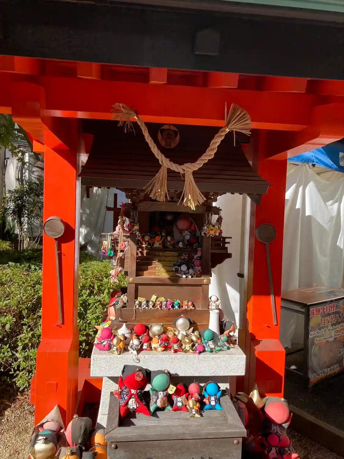 境内右側にある、さるぼぼ七福神の「毘沙門天」。左隣には<おみくじガチャ>。子供連れ家族やカップルが楽しめる設定で、インスタ映えもするらしい...(^_^;)