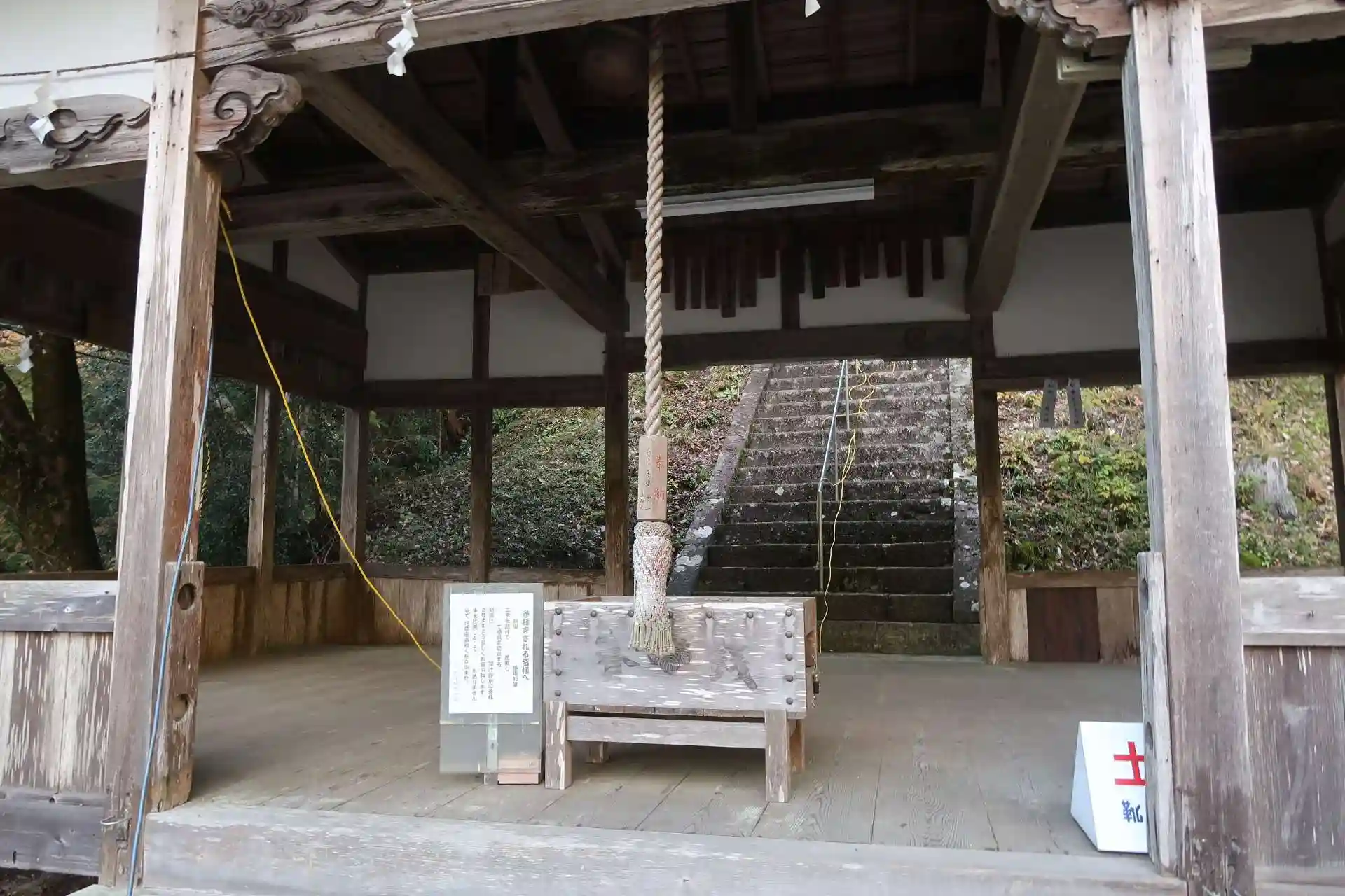 県道86号線(以前は国道256号線だったが県道に変更)から横谷峡に向かう交差点(信号機の無い三差路)の角に在ります。駐車場が無いので広めの路肩に駐車。石段を上がると拝殿、右側に社務所がありますが人の気配無し。拝殿横を回り込んで石段を上がると本殿。本殿で手を合わせました。先に記載の通り、無人でしたので御朱印は頂いておりません。