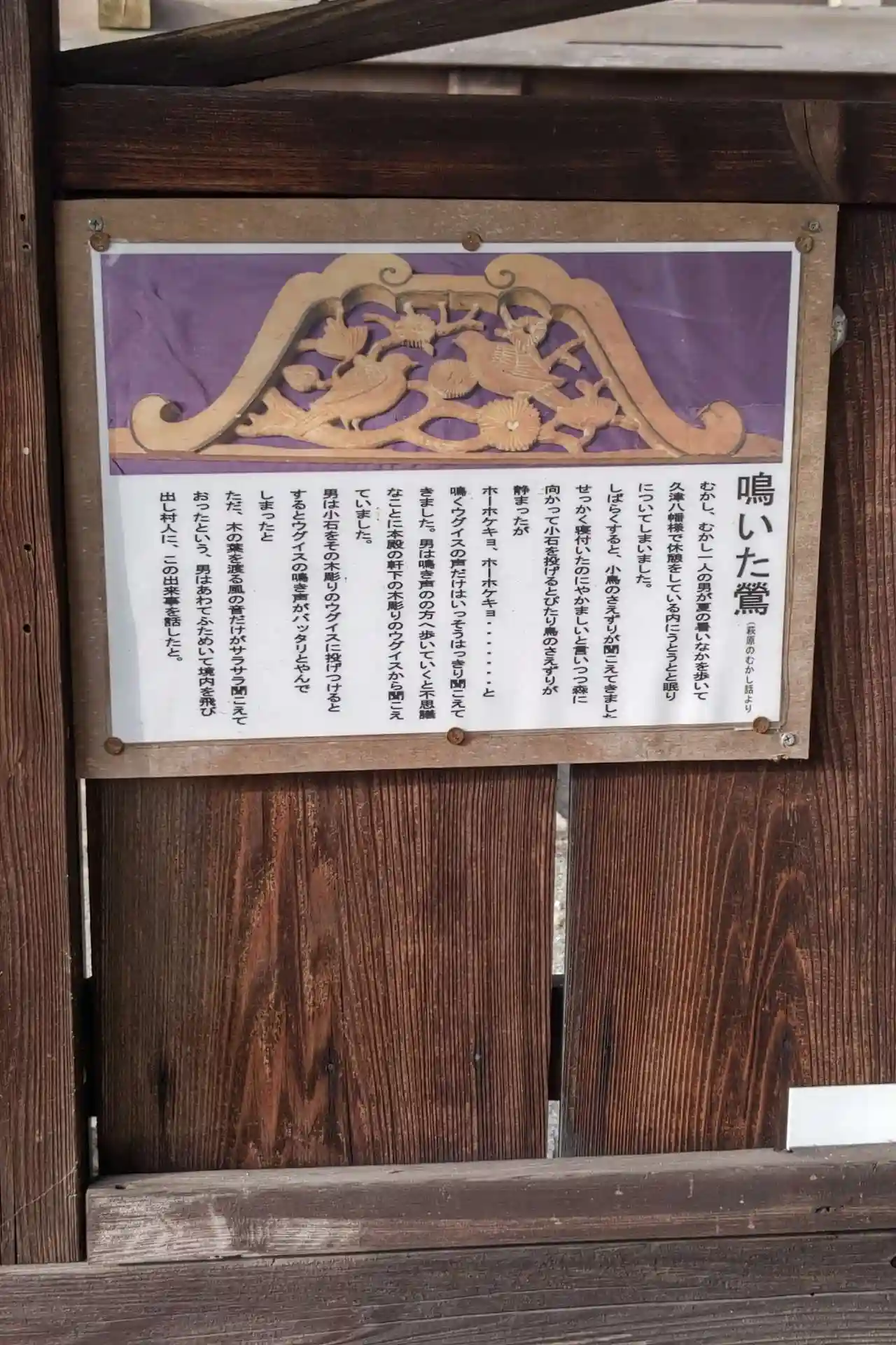 暗くてちょっと見にくいですが、中央に鳴いたウグイスの彫刻があります。