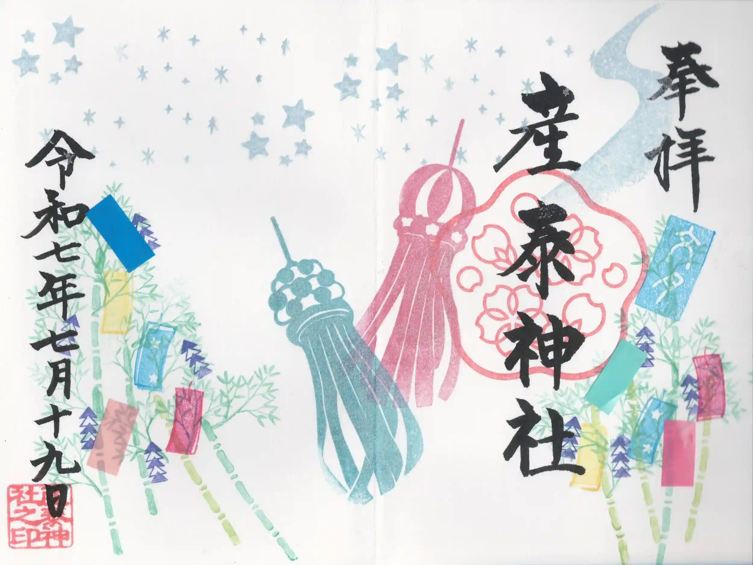 今月の御朱印(見開き)と夏詣(片面)の御朱印をお願い、「受付の巫女さん新しい人なのかな?」横に就いた巫女さんが受付のやり方を説明していました。