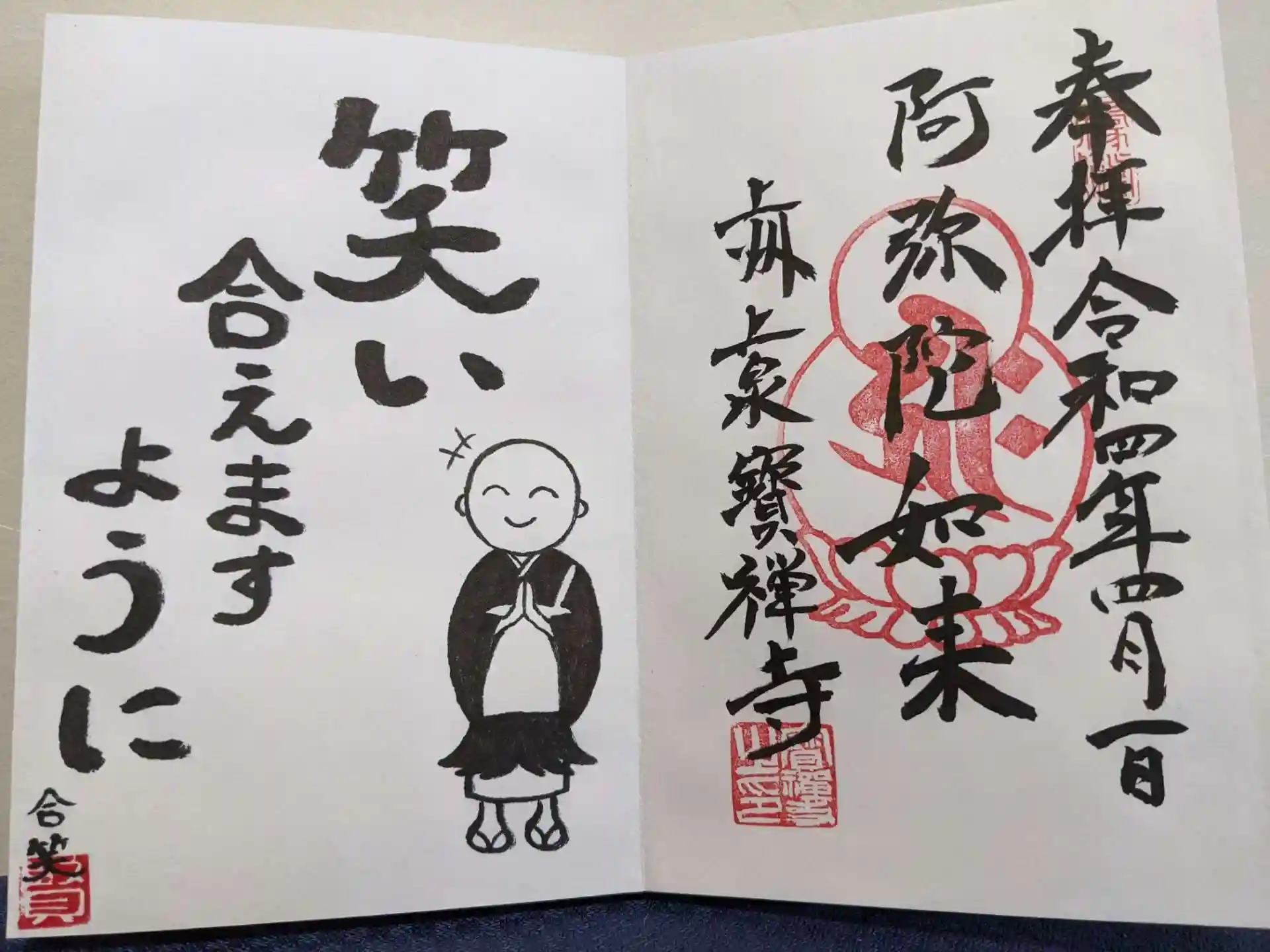若いお坊さんが、お寺の掲示板を絵付きで書いていて、その法語と絵を御朱印帳に書いてくれました。
