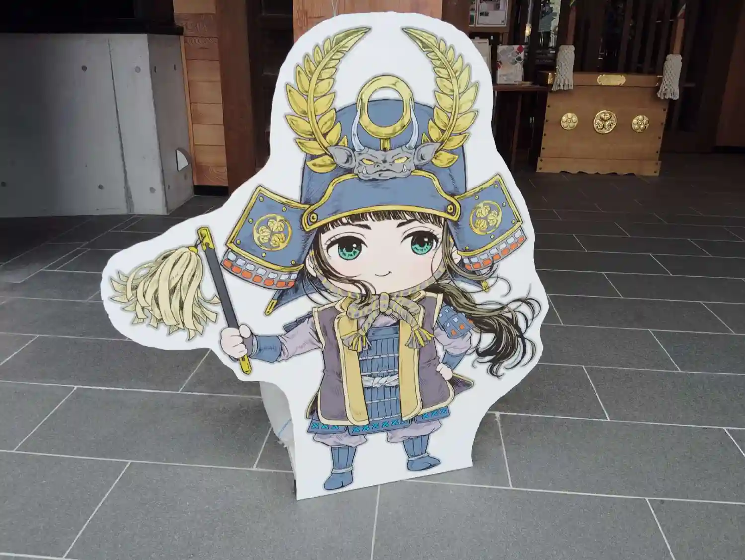 手水舎の右側に入口がある<社務所>。内部は冷暖房完備、授与所にカフェ併設。休憩スペースでは、御祭神の徳川家康公のアニメを放映している。