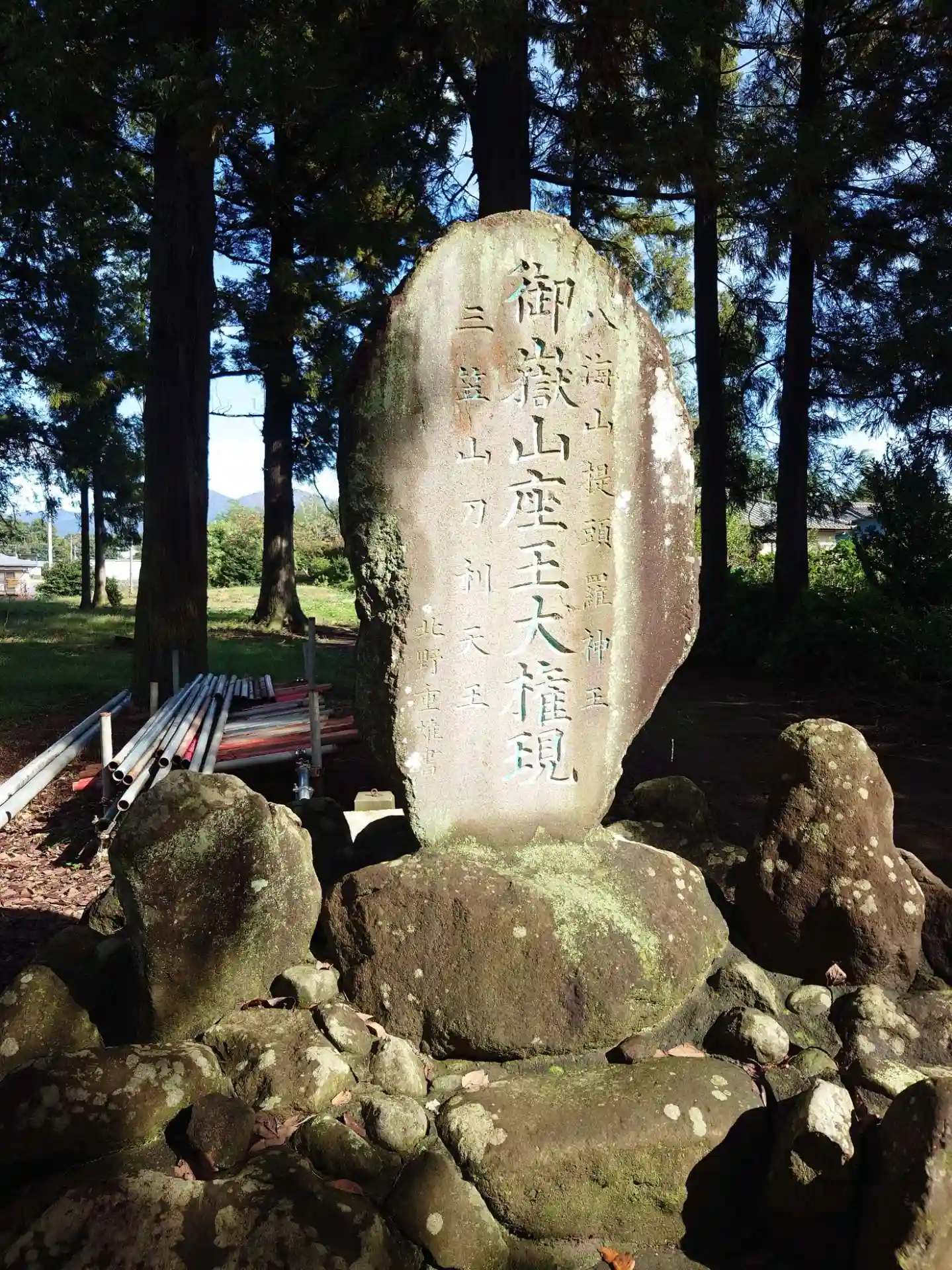 中央に御嶽山座王大権現、左に三笠山刀利天王、右に八海山提頭羅神王と刻まれています