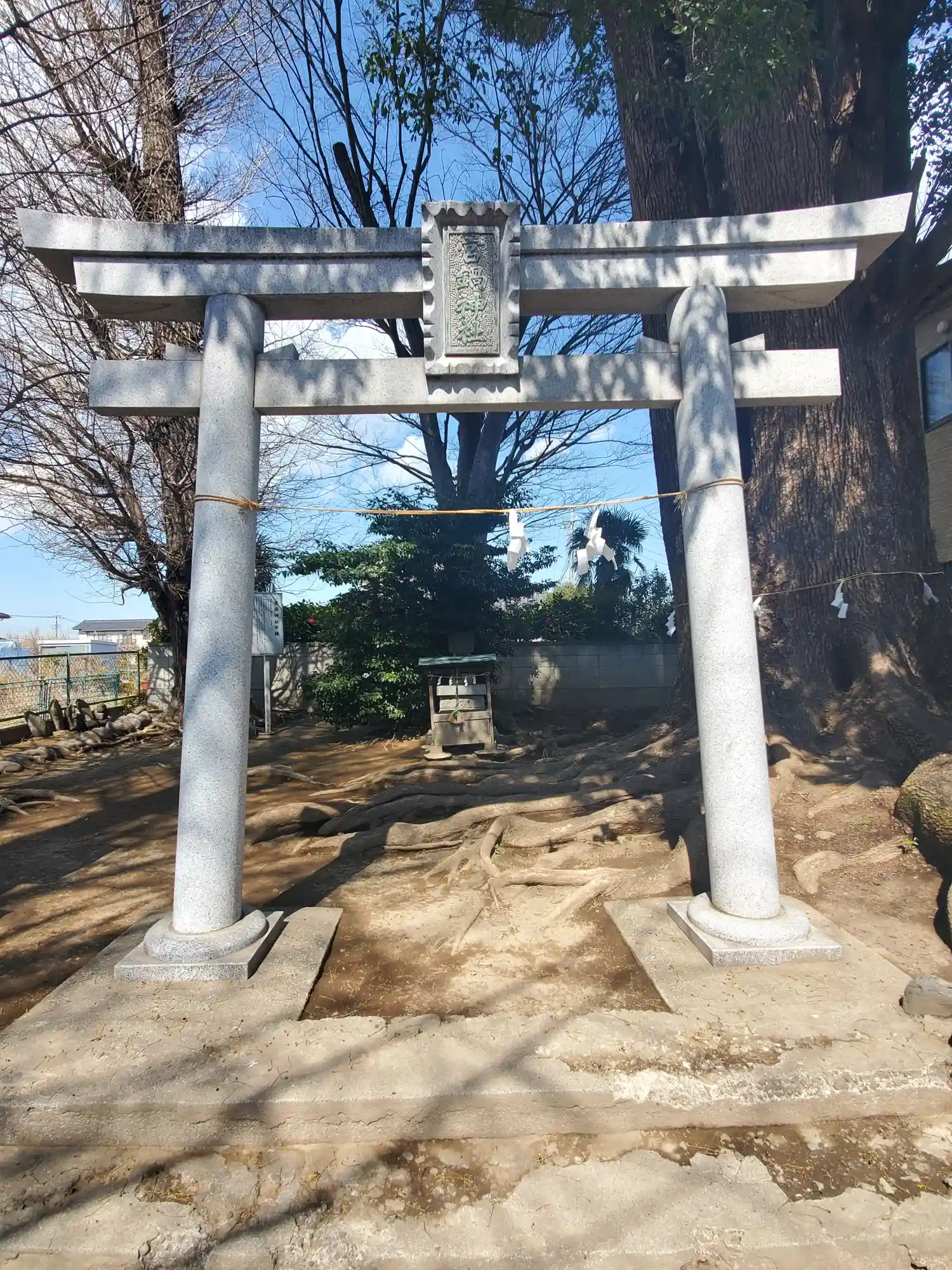 住宅地の中にひっそりと建立している宮鍋神社。こじんまりした祠と、立派な鳥居と根を張った大きな御神木…