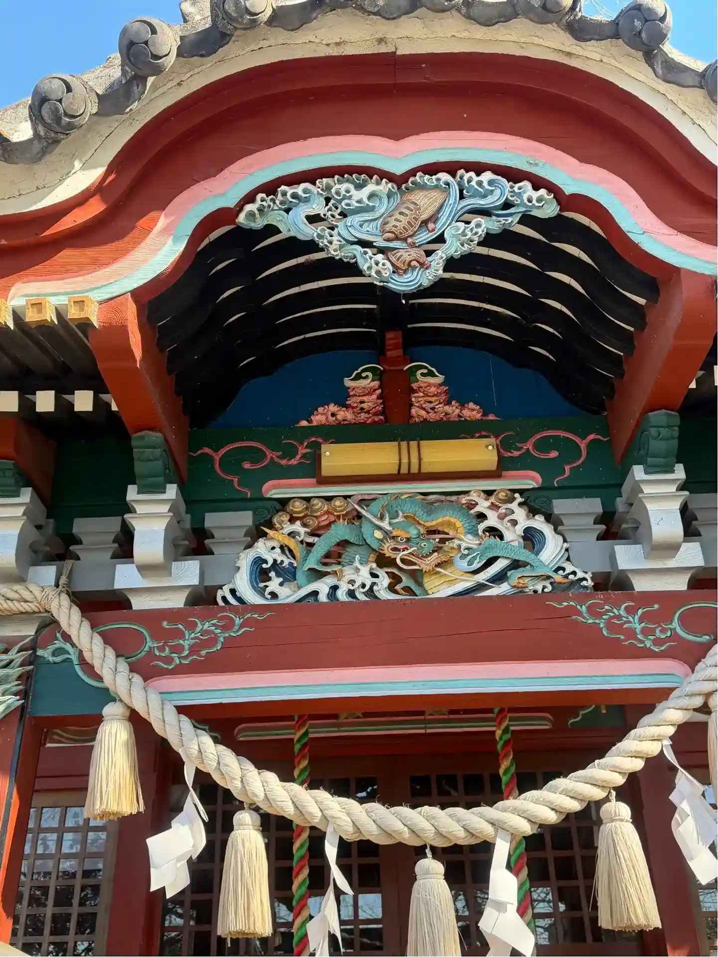 拝殿の彫刻は色彩豊かさで精巧です。