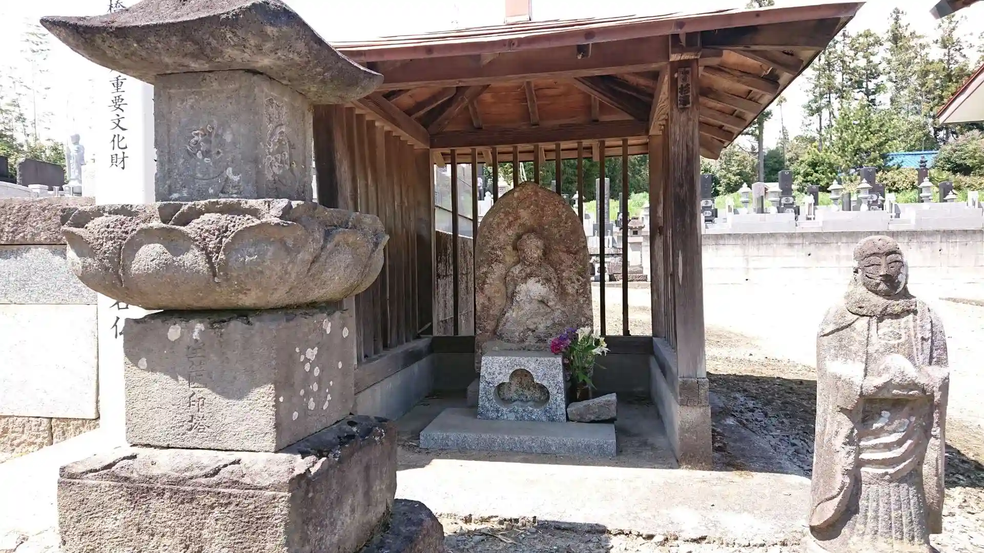市指定文化財の凝灰岩石仏がありますが、道を挟んだ反対側にも、指定文化財の双体道祖神があります。祝言像と言って、銚子と盃を持つ姿です。