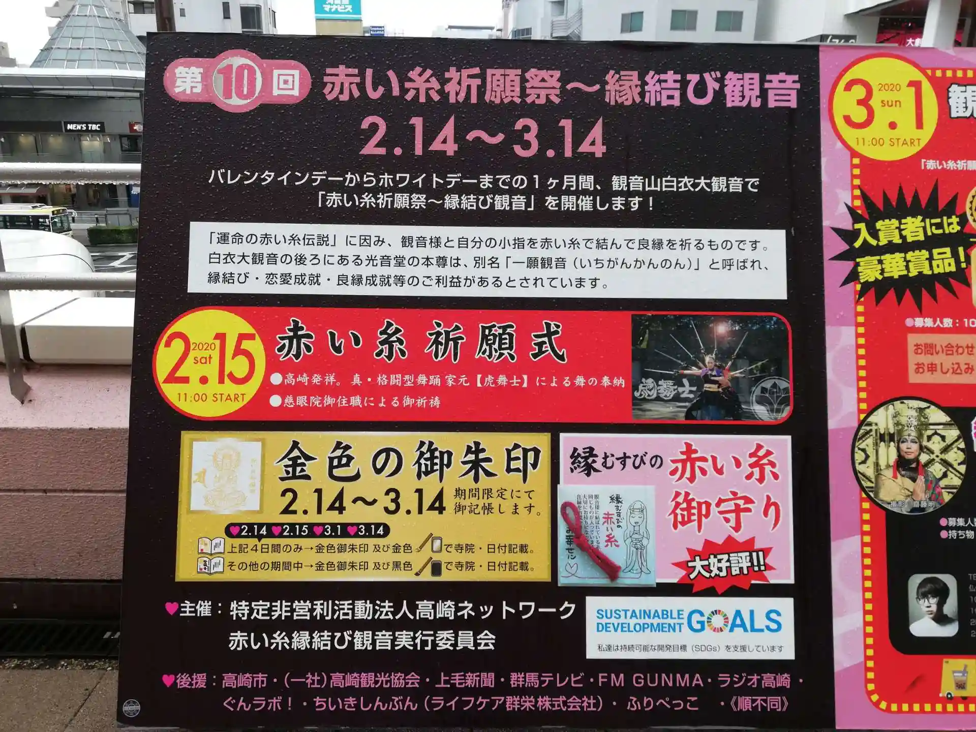 赤い糸祈願祭~縁結び観音のイベント告知看板が高崎駅前に設置されていました。4日しかない特別な日に、たまたま有休を取り雨の中群馬へ来たのも、観音様とのご縁が結ばれたからなのでしょう。