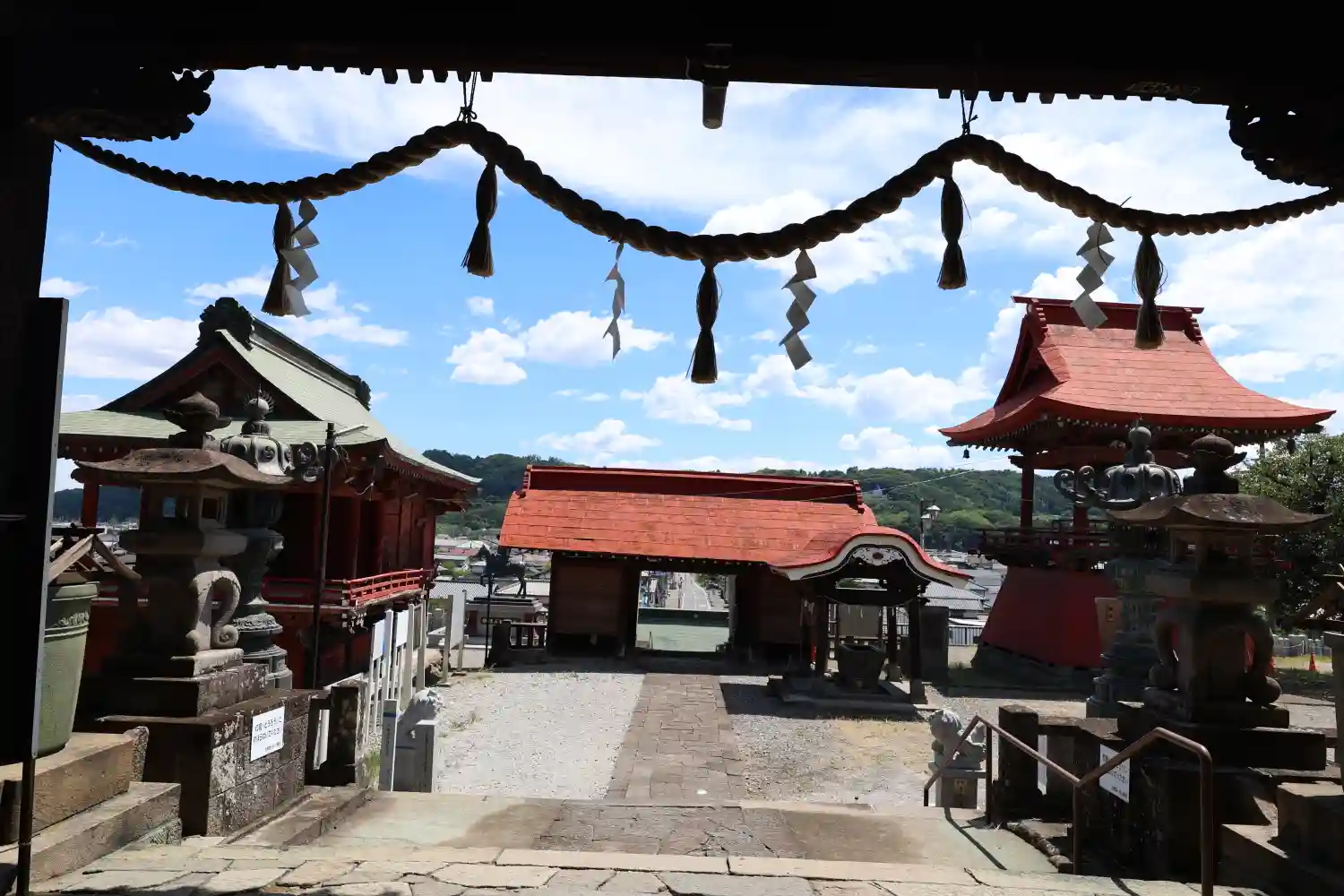 神門の屋根の向こう、参道先に鳥居