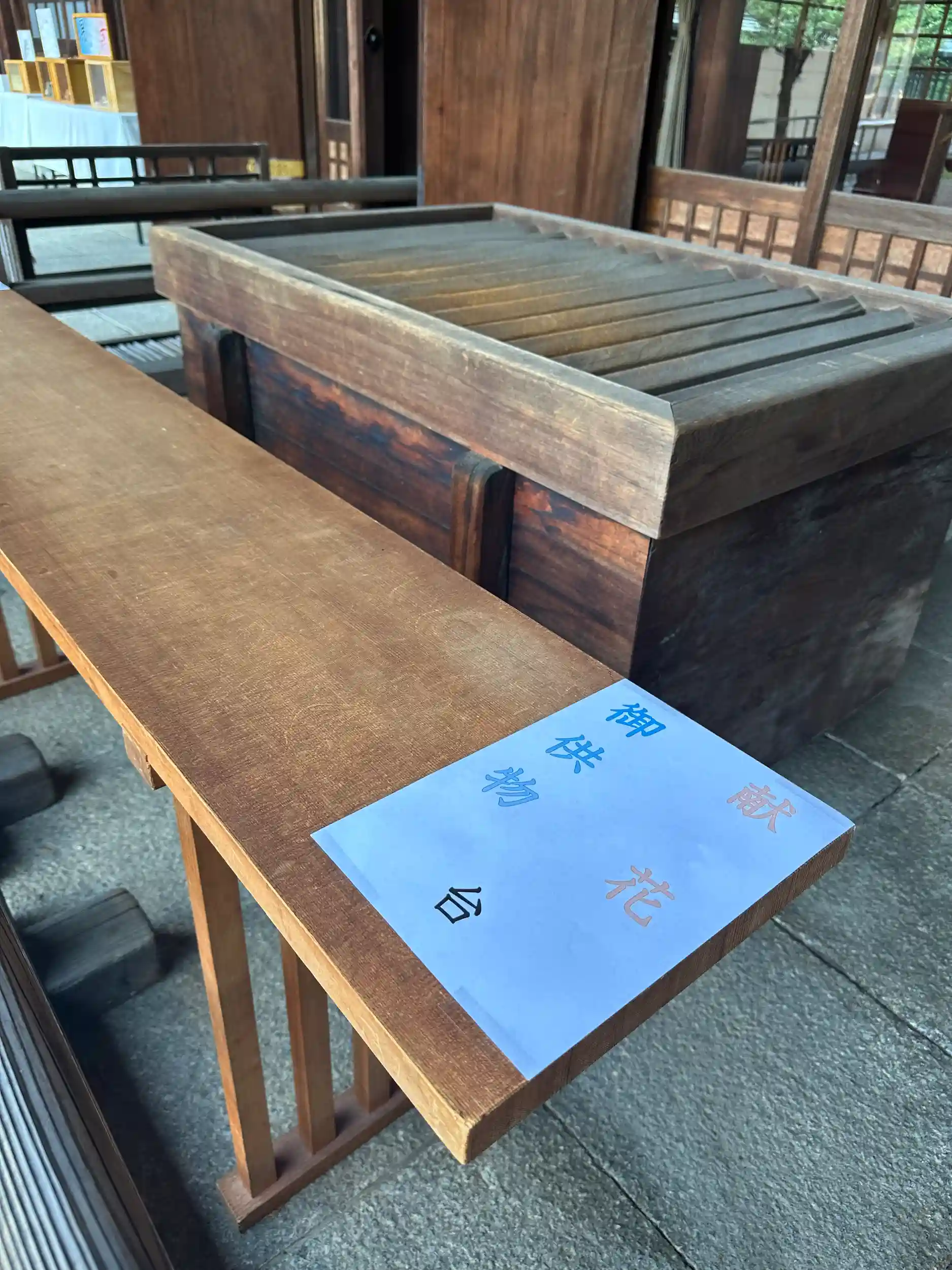 今年もご社殿賽銭箱前に献花・御供物台