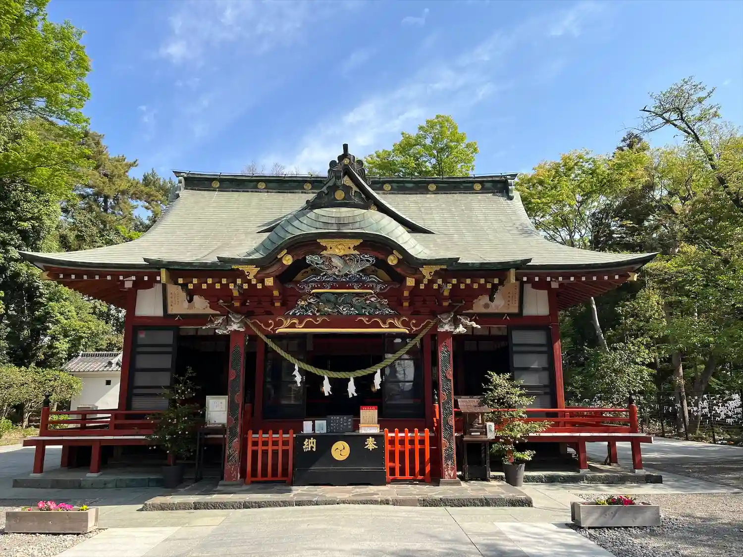 拝殿上部は色彩鮮やかで華やかな彫刻が素晴らしい。