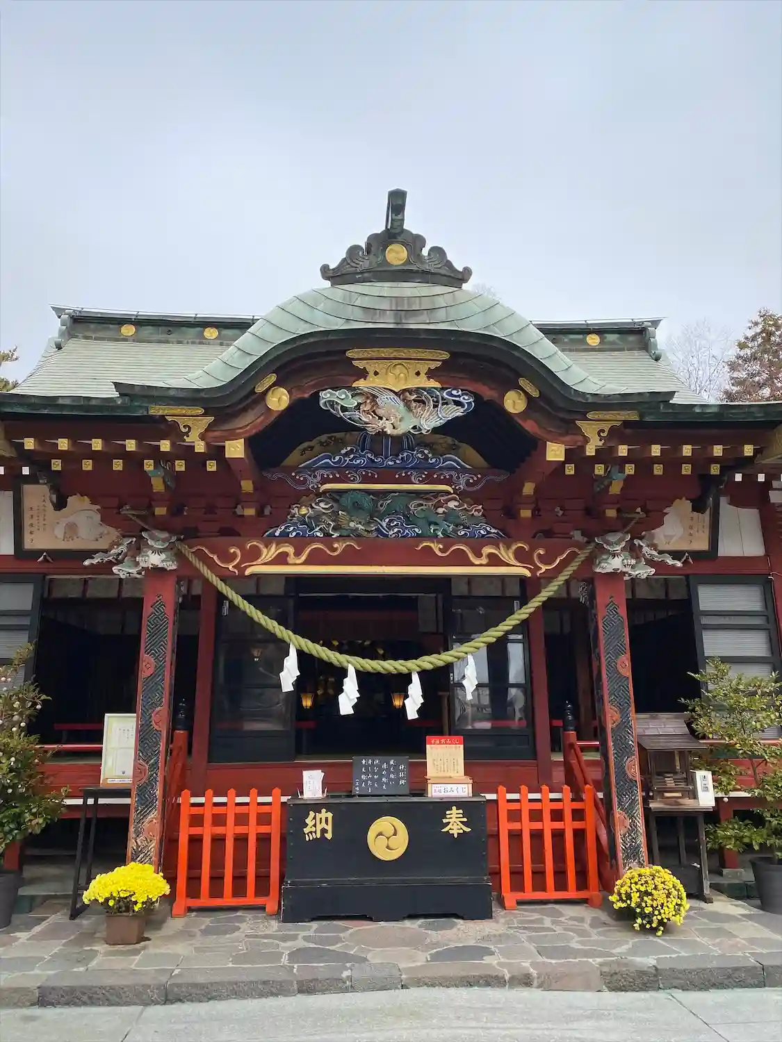 拝殿上部は色彩鮮やかで華やかな彫刻が素晴らしい。
