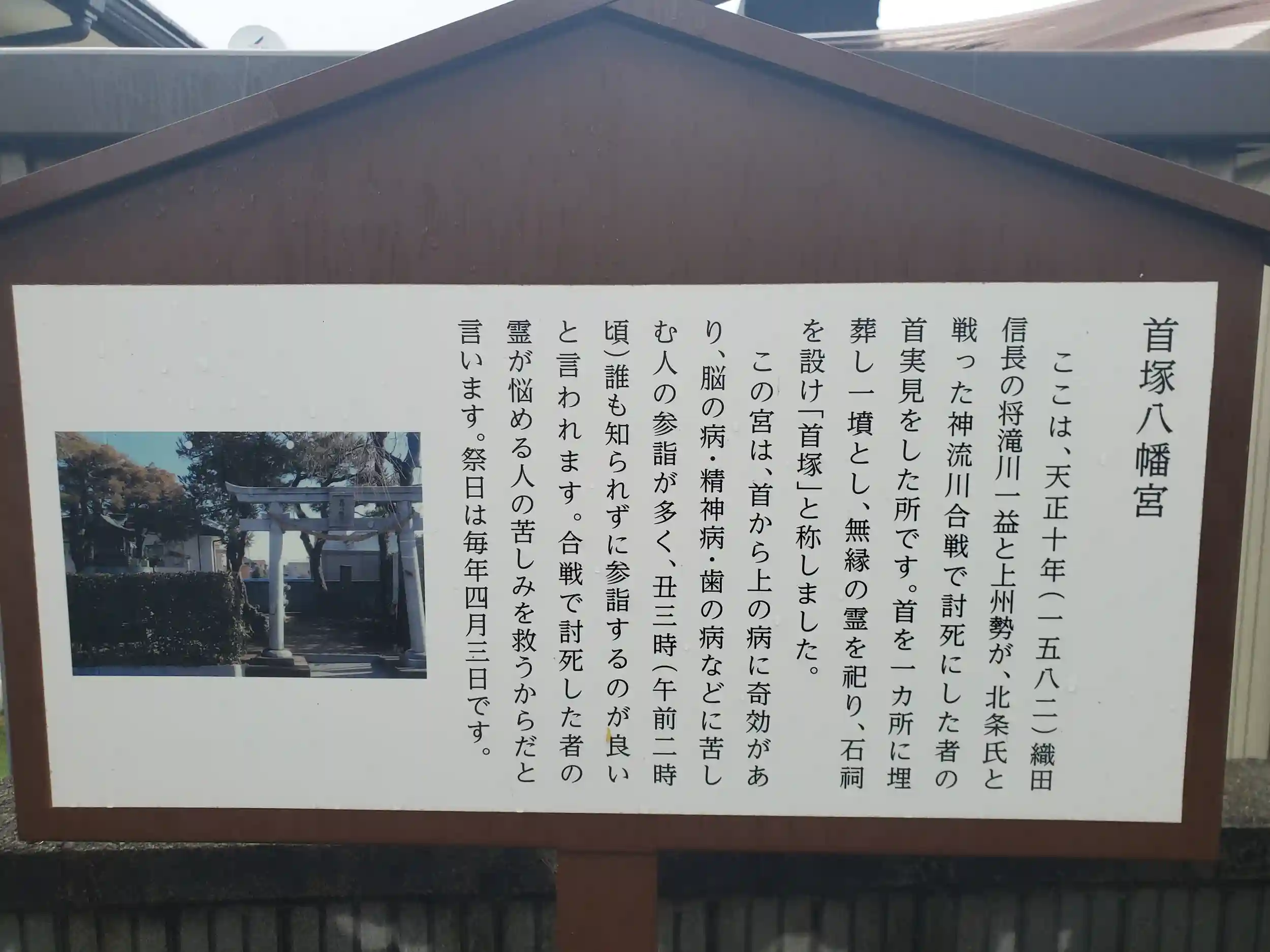 ここは北条方が討ち取った滝川方将兵の首実見をおこなって埋めた所で、土地の人々が首供養のために建てた八幡社とのこと!?((( ;゚Д゚)))ガクガクブルブル
