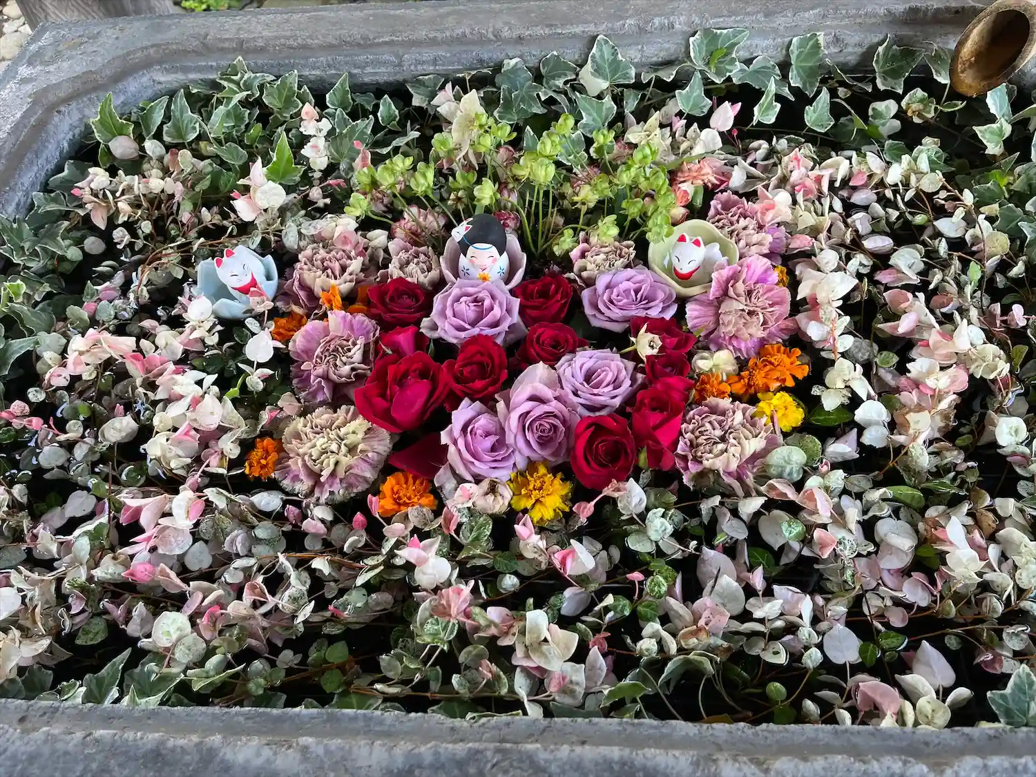 参道左手には花手水。猛暑の為ドライフラワーを飾られていたようですが、生花を再開されたようです。💐