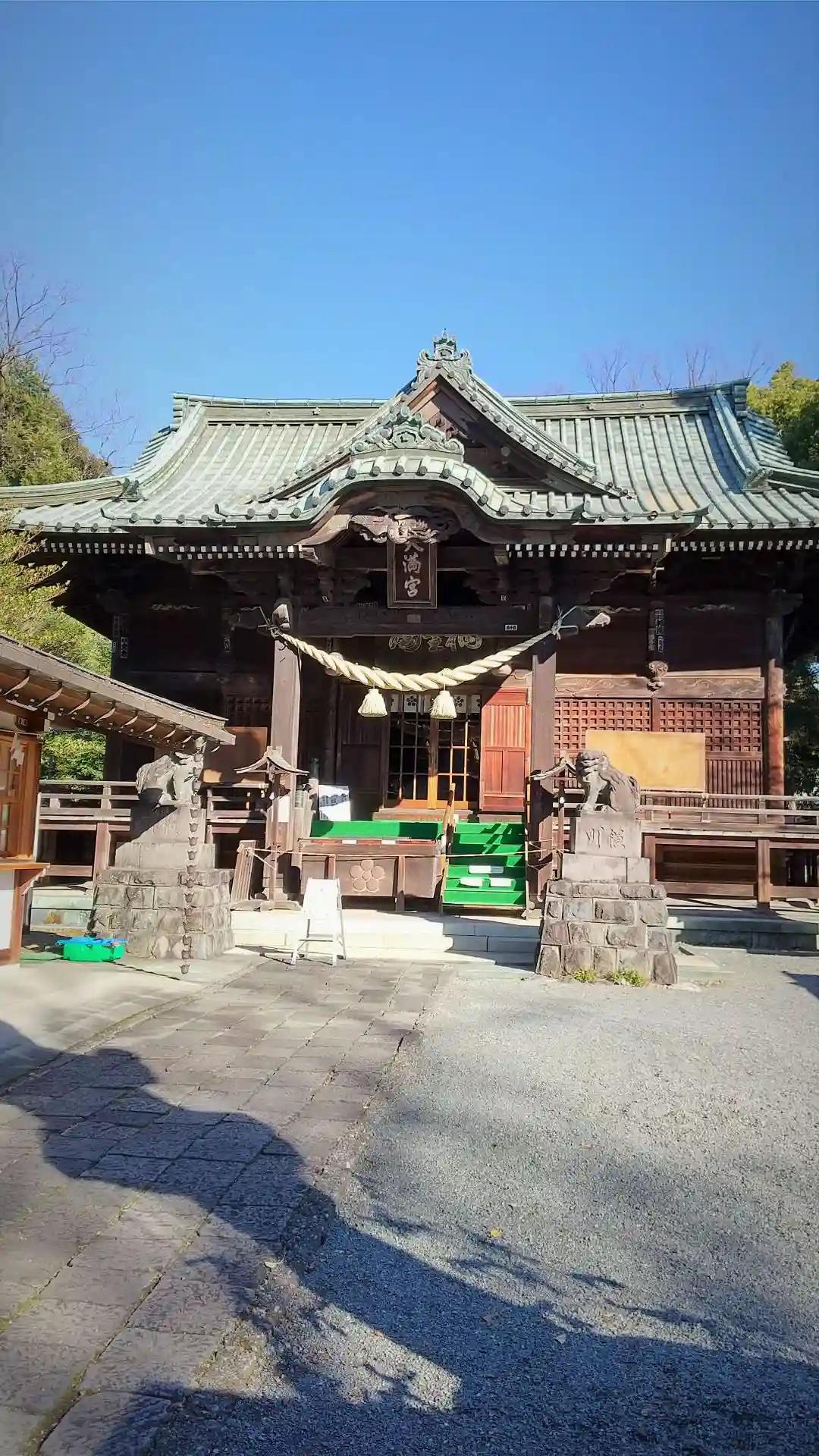 <拝殿>全景。大きく重厚感がある。扁額には縦書きで<八幡宮>。手前左側の建物は授与所。