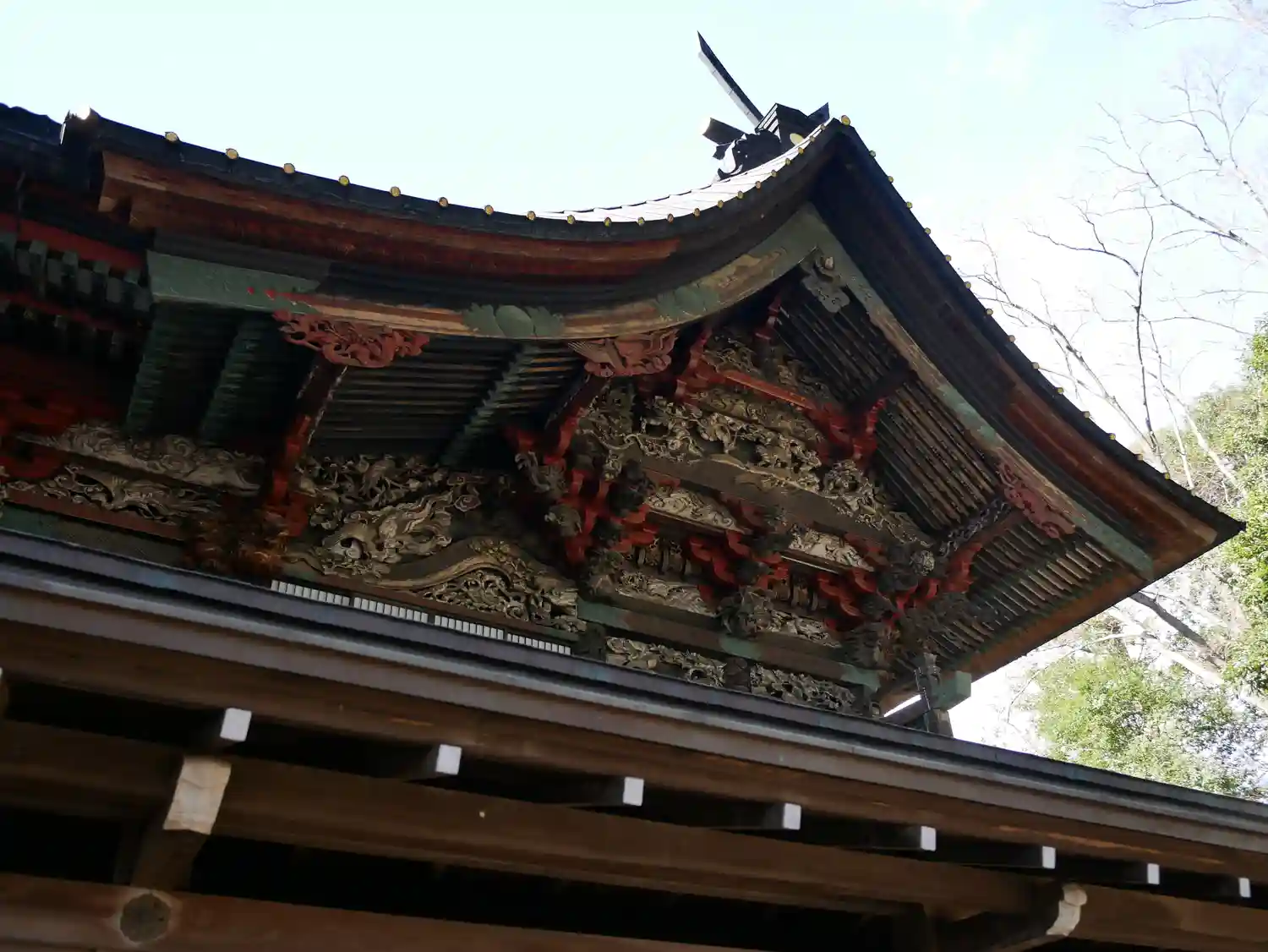 拝殿後ろの<本殿>と、本殿・拝殿を繋ぐ<石の間>には、繊細な彫刻が施されている。彩色が褪せた感じも味わい深い。