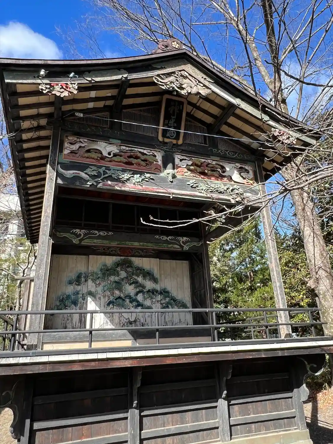 宝船神社の右隣にある<神楽殿>。黒い躯体に彫刻に彩色が施された綺麗な神楽殿。