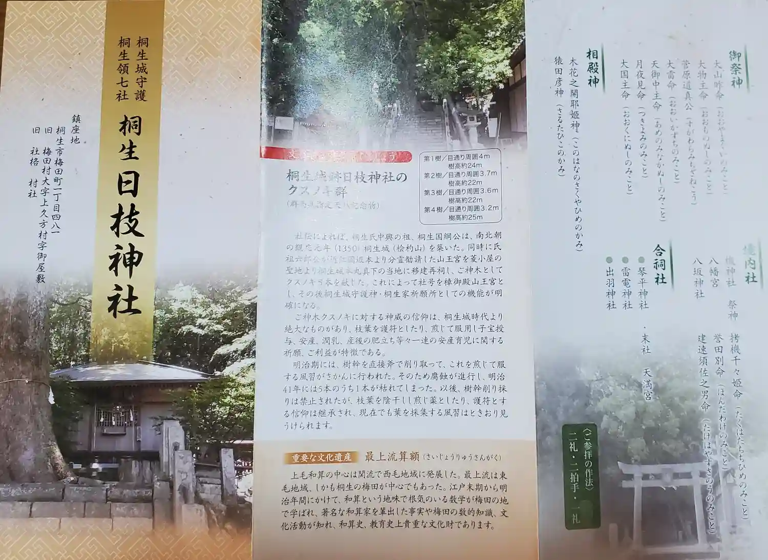桐生国綱公の植えた五本の御神木のクスノキがここからでも目立つ