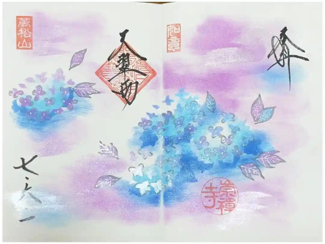 二面見開きの御朱印です。真ん中に善財の文字と佛法僧縁の三宝印が入り、右面は紫陽花のイラスト、上部に印、左面は紫陽花の葉の上にカタツムリが描かれ、左上に萬松山の印、左下に崇禅寺の印が押されています。
