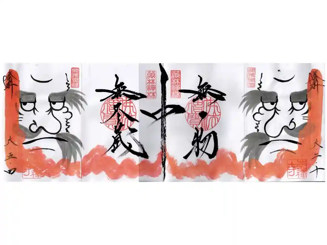 四面見開きの御朱印です。四面の丁度真ん中の縦辺を中心に線対称のデザインで、左右に一対ずつ達磨大師の絵と朱色の髭、4種類(佛法僧寳、萬林禪林、興佛有因、崇禅寺)の印が入っています。