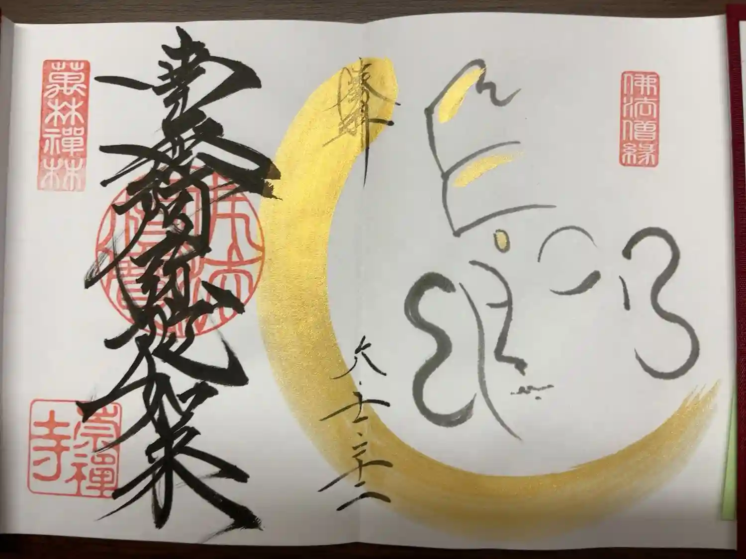四面見開きの御朱印です。真ん中に大圓鏡智の文字と佛法僧寳の三宝印が入った金色の達磨が大きく描かれ、右面は「写す鏡に我はなし」の文字、右上に佛法僧縁の印、真ん中に菱形の印が入り、左面は「識なく 別なし そのまま佛心」の文字、左上に萬林禪林の印、真ん中に菱形の印、左下に崇禅寺の印が押されています。