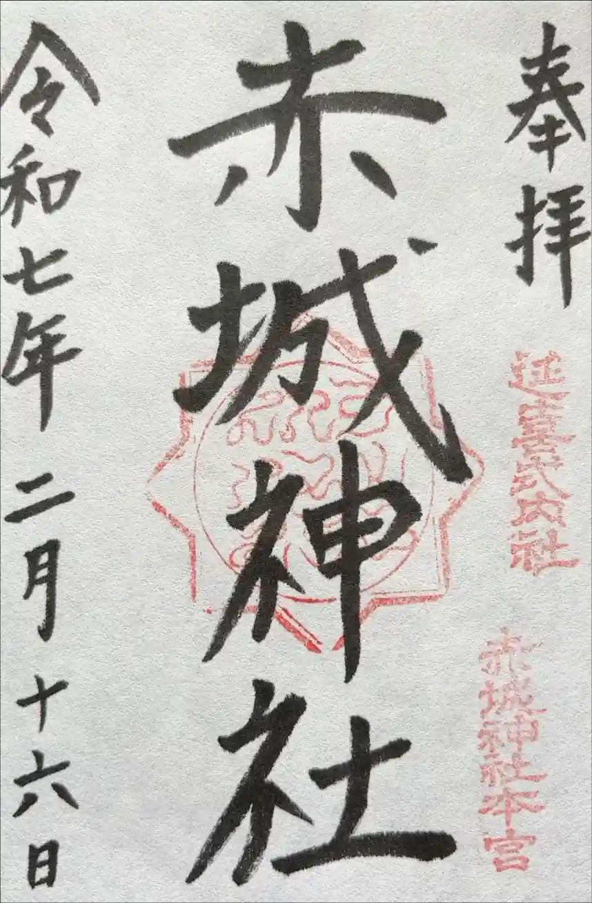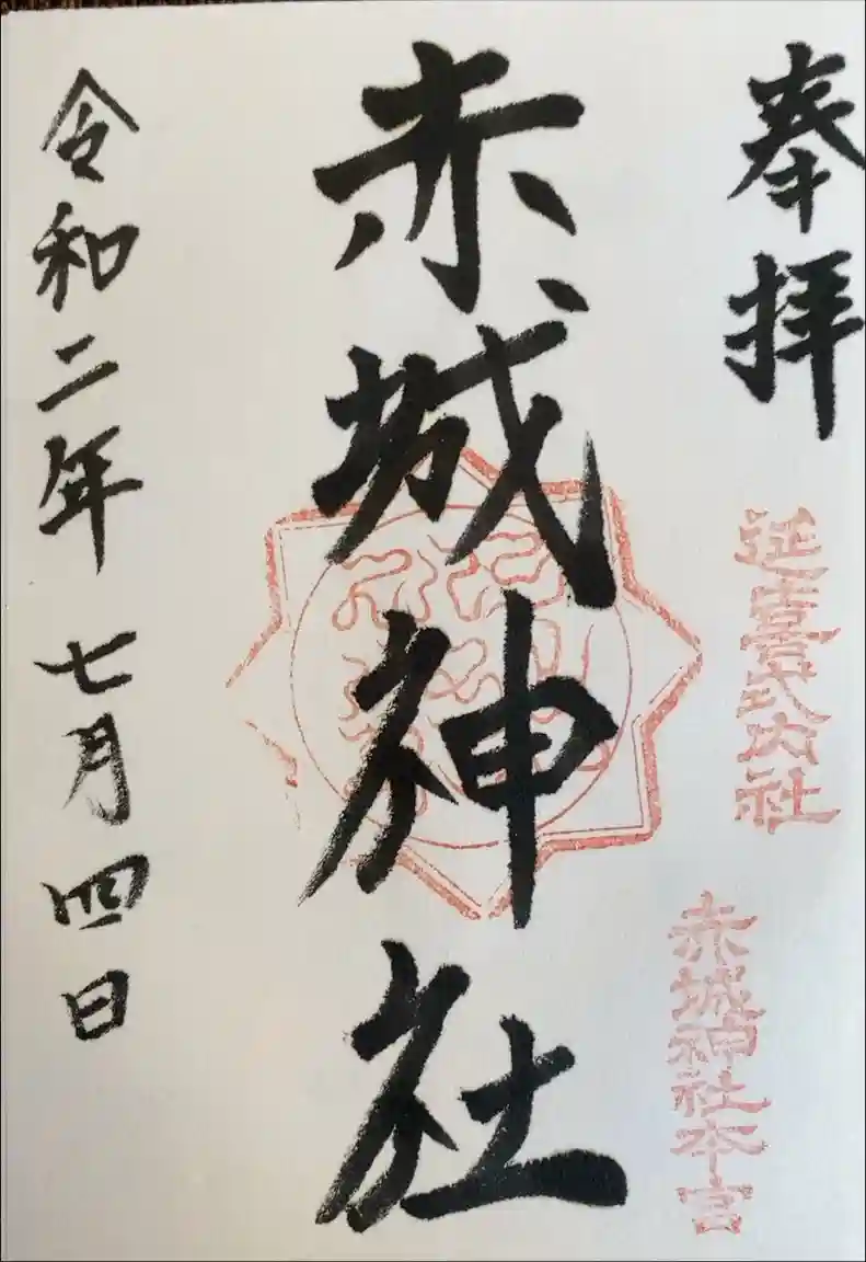 右下に延喜式内社、赤城神社本宮の印が押された御朱印です。社殿が描かれた御朱印帳があります。 | |||