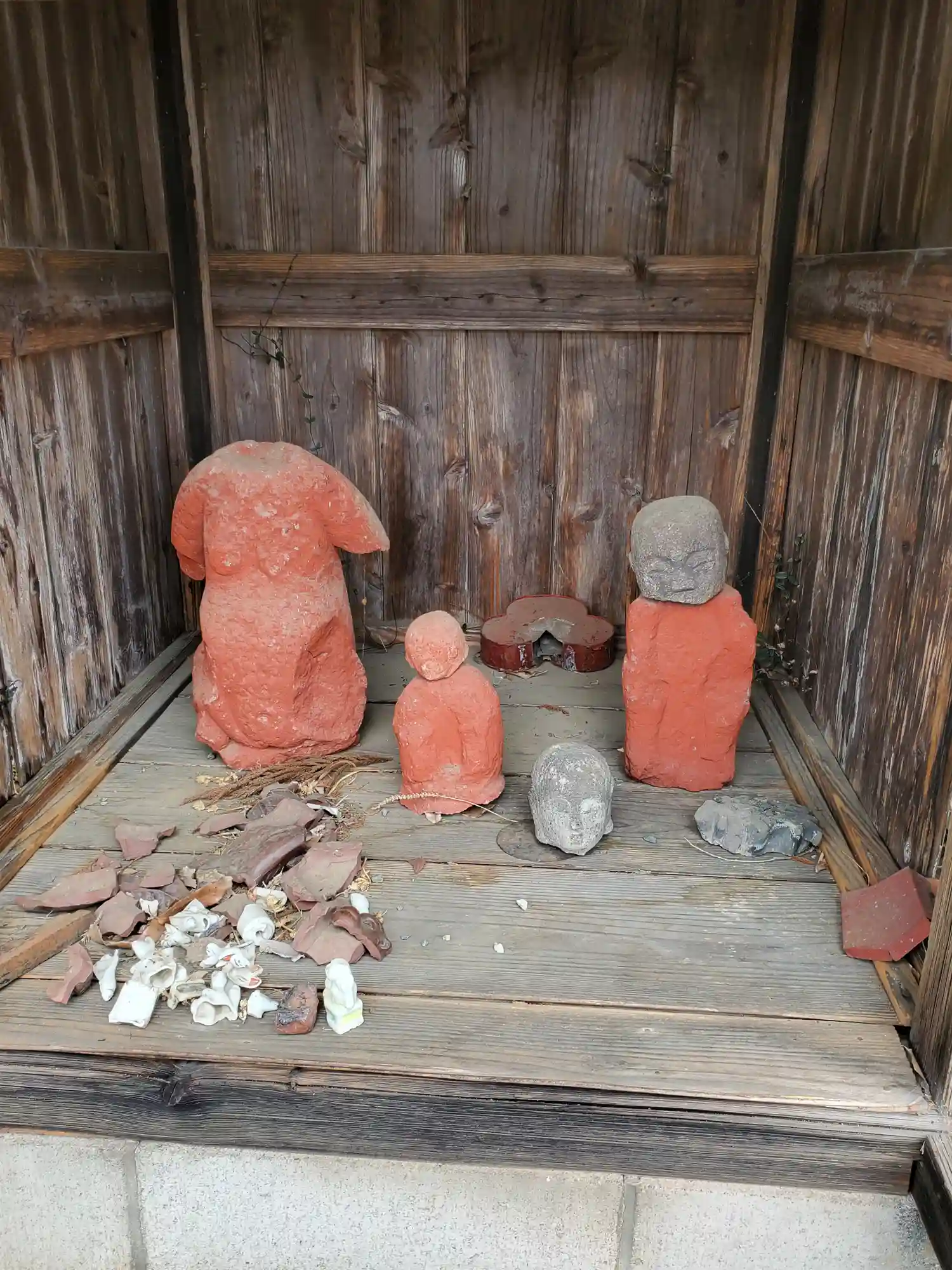 真ん中のお堂には壊れたり修復された白狐やお地蔵さんが祀られてた
