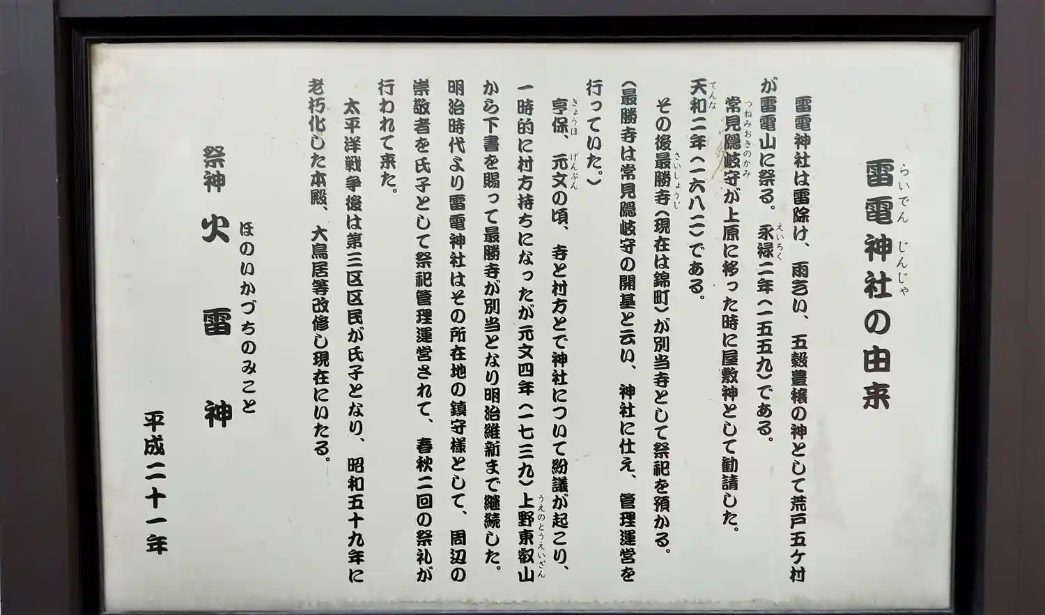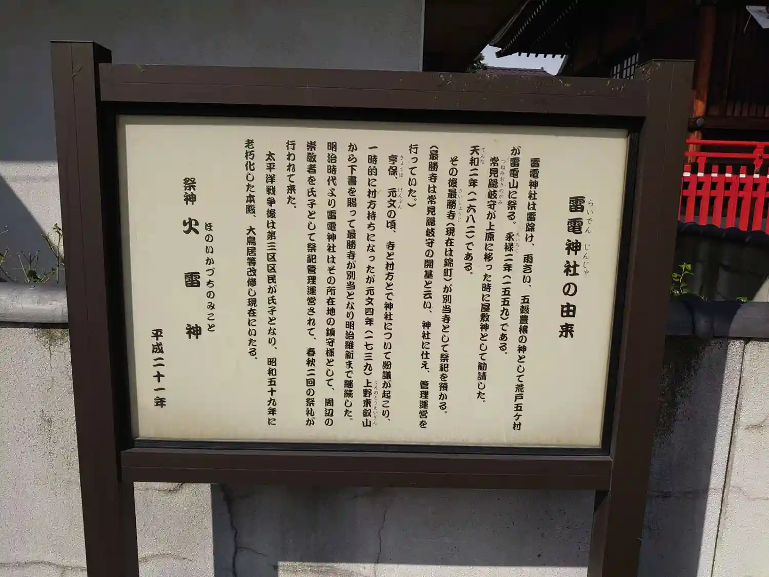 | ご祭神 | 《主》火雷神 《配》大雷神・別雷神 《境内社》八幡神社 | |