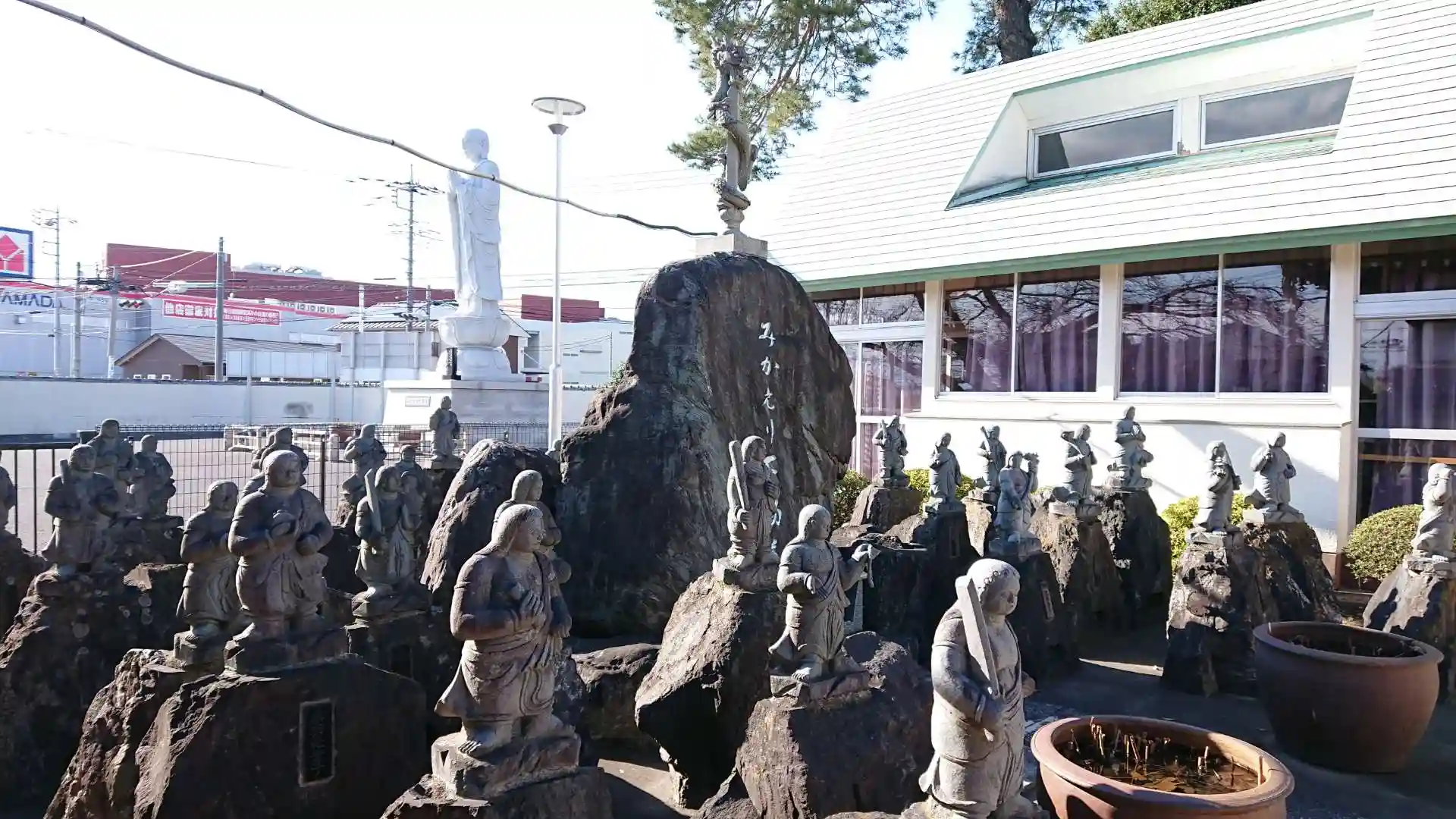 奥の庭には羅漢像がならび、門の横には一香一華を添えて礼拝供養すると、重罪吹き飛ぶ宝塔が建っています。