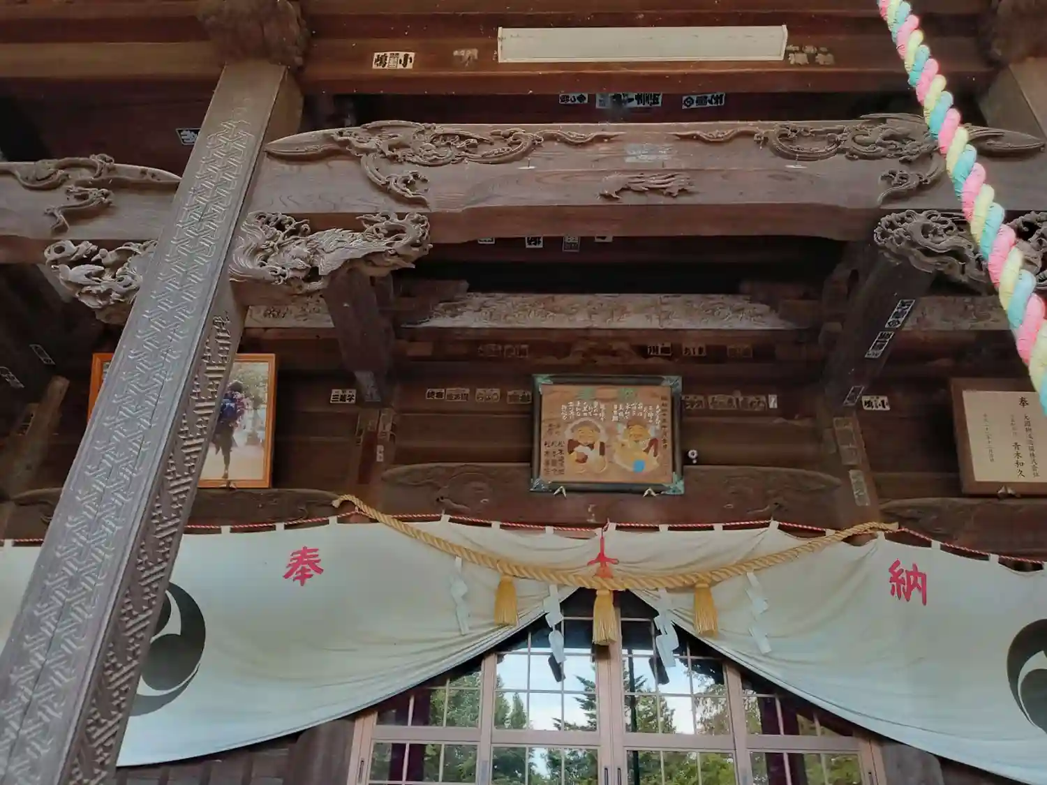 <拝殿>正面。凝った彫刻、きれいな神社幕、ビビッドな赤色の彩色が、いずれも印象に残る。