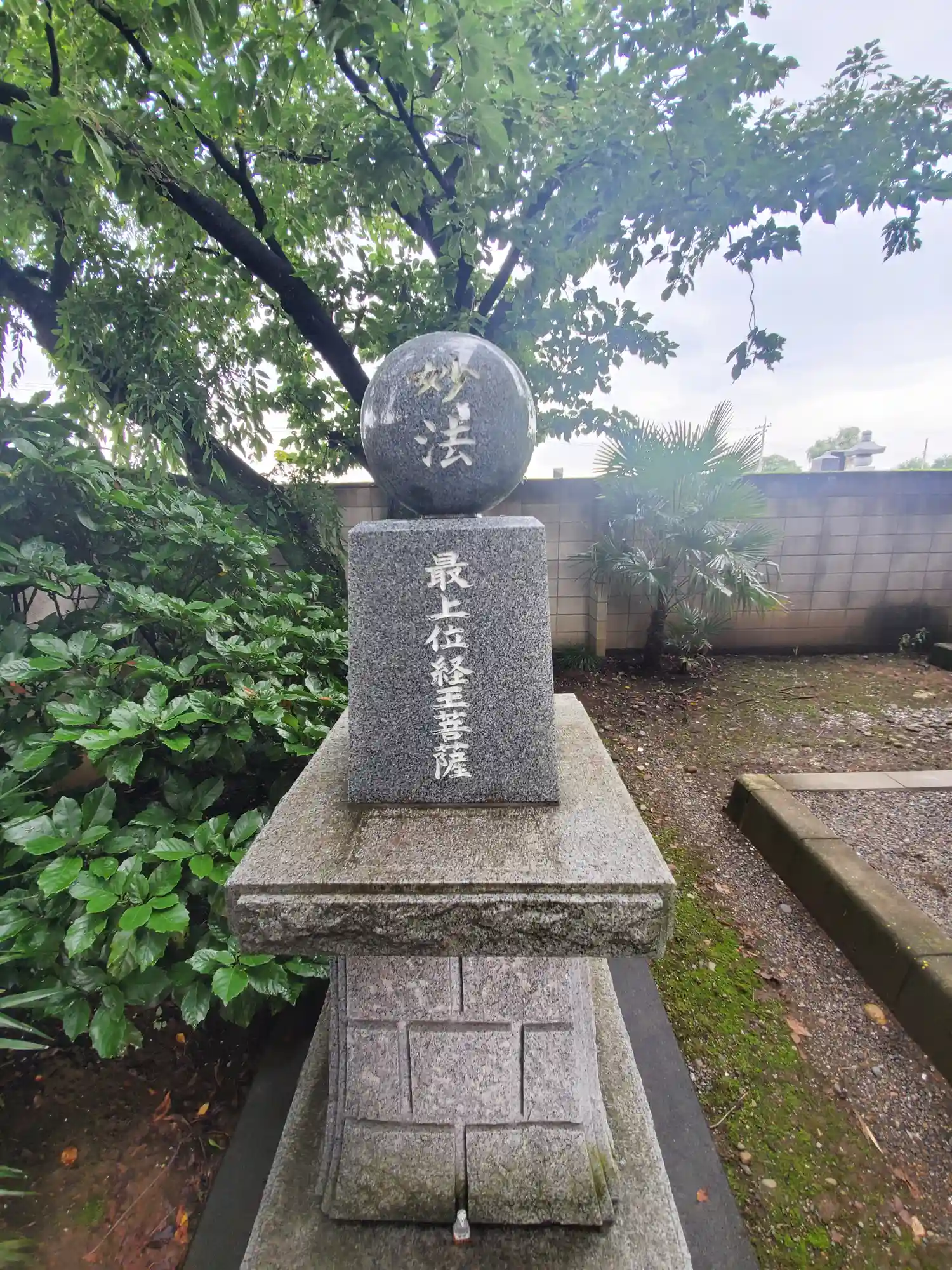 お宮はなく妙法と書かれた石球が安置