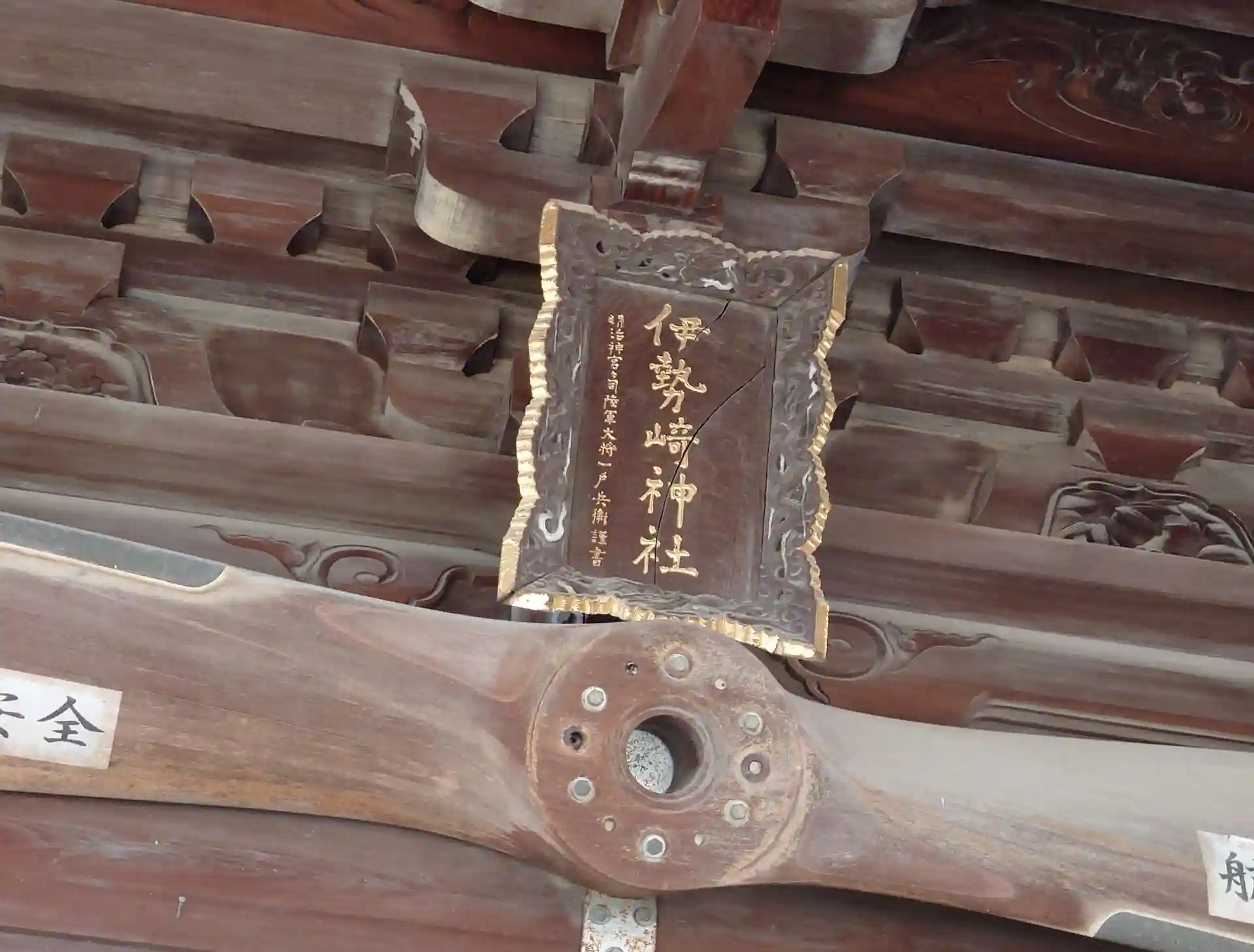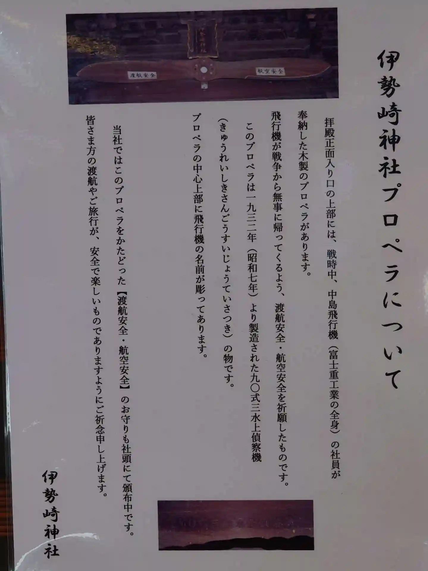 旧・中島飛行機(のちの富士重工業、現・SUBARU)の社員が昭和12年(1937)に、戦地から無事に帰還するよう祈願して奉納した九〇式三号水上偵察機のもの