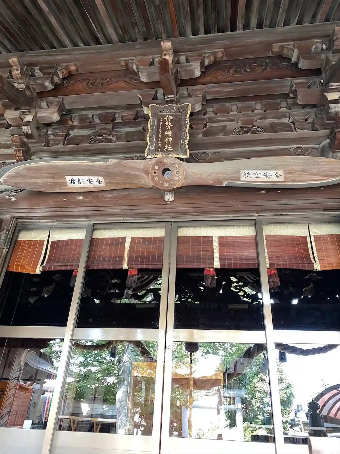 拝殿入口のガラス戸の上にプロペラが飾られています