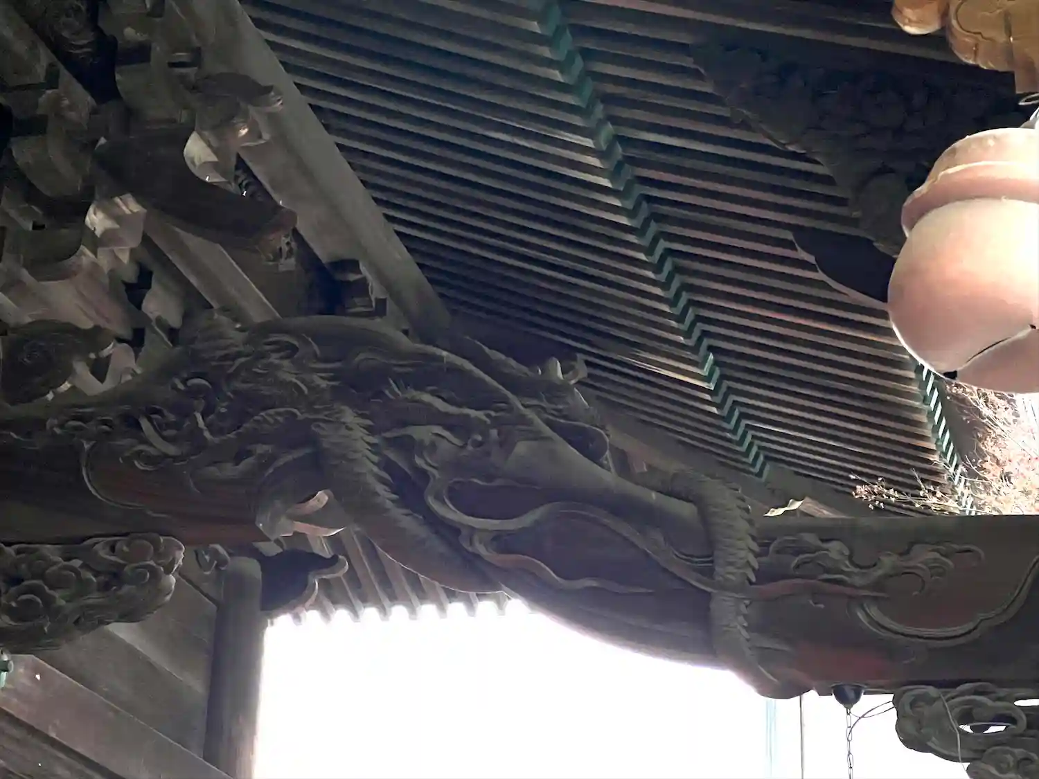 拝殿を見上げると、大きな木製の…