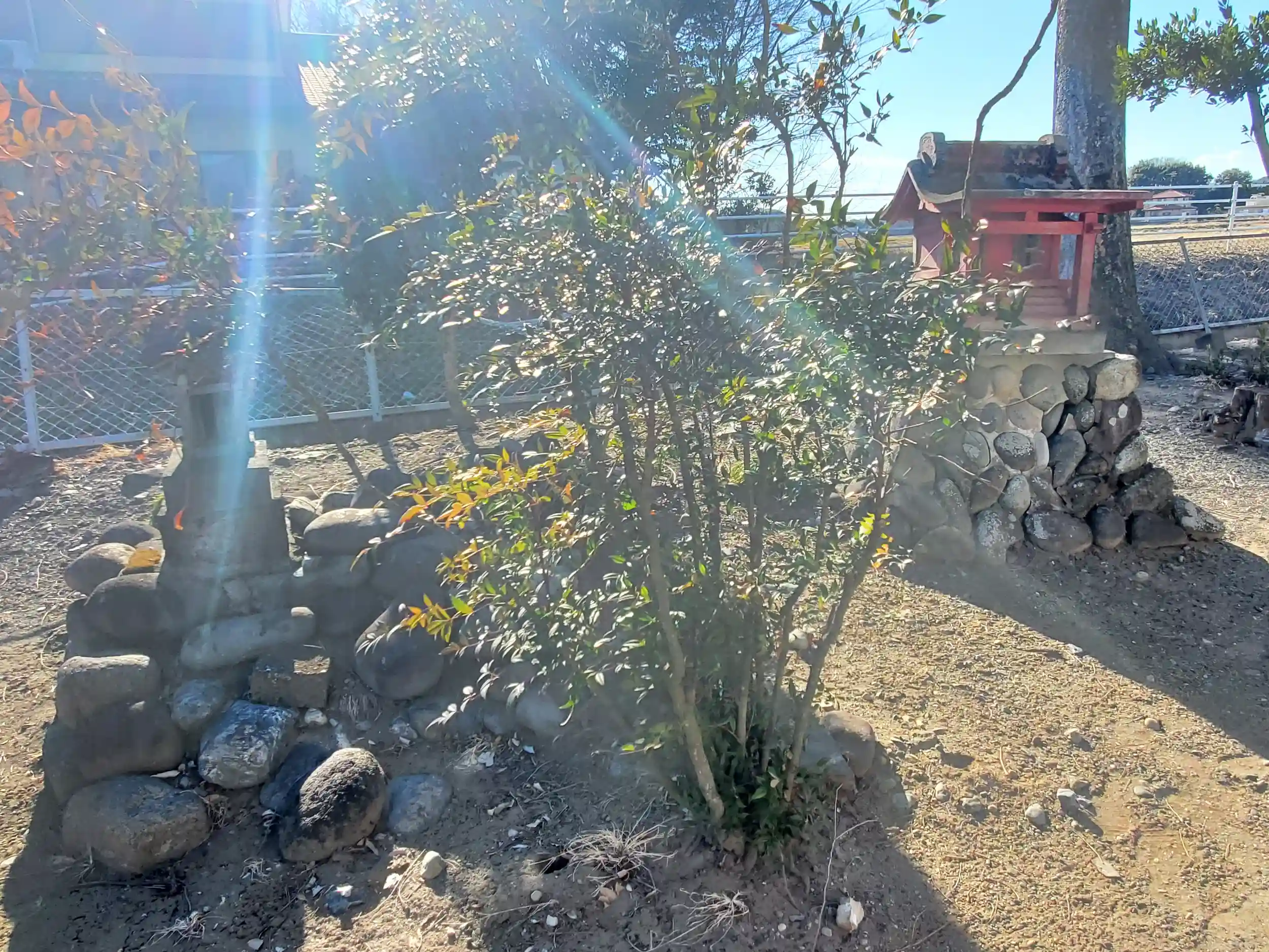 石祠が一つと扉が二つある鎮守社がありましたが祭神不明です