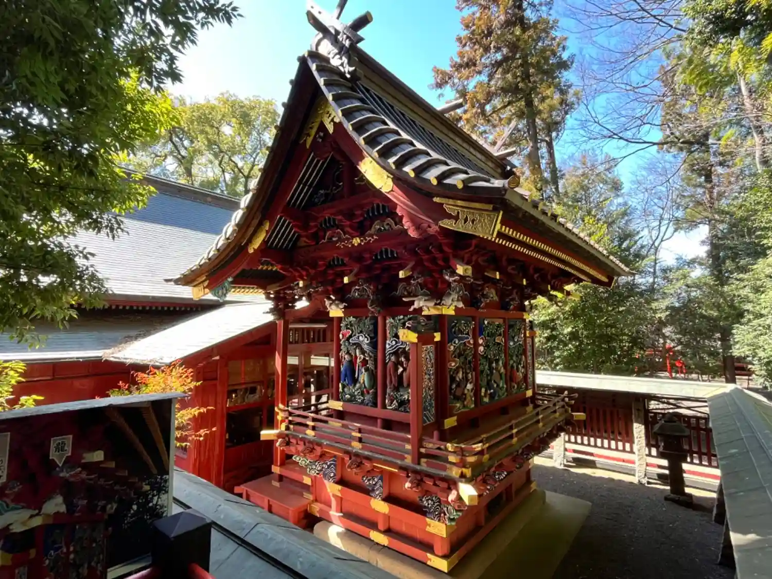 内部の格天井(ごうてんじょう)には優麗な12面の花鳥画が描かれ、中央には金龍の彫刻が、また正面欄間には三龍の彫刻が施され、周囲の見事な彫刻とともにその意匠美を今に伝える貴重な建築遺産です😊
