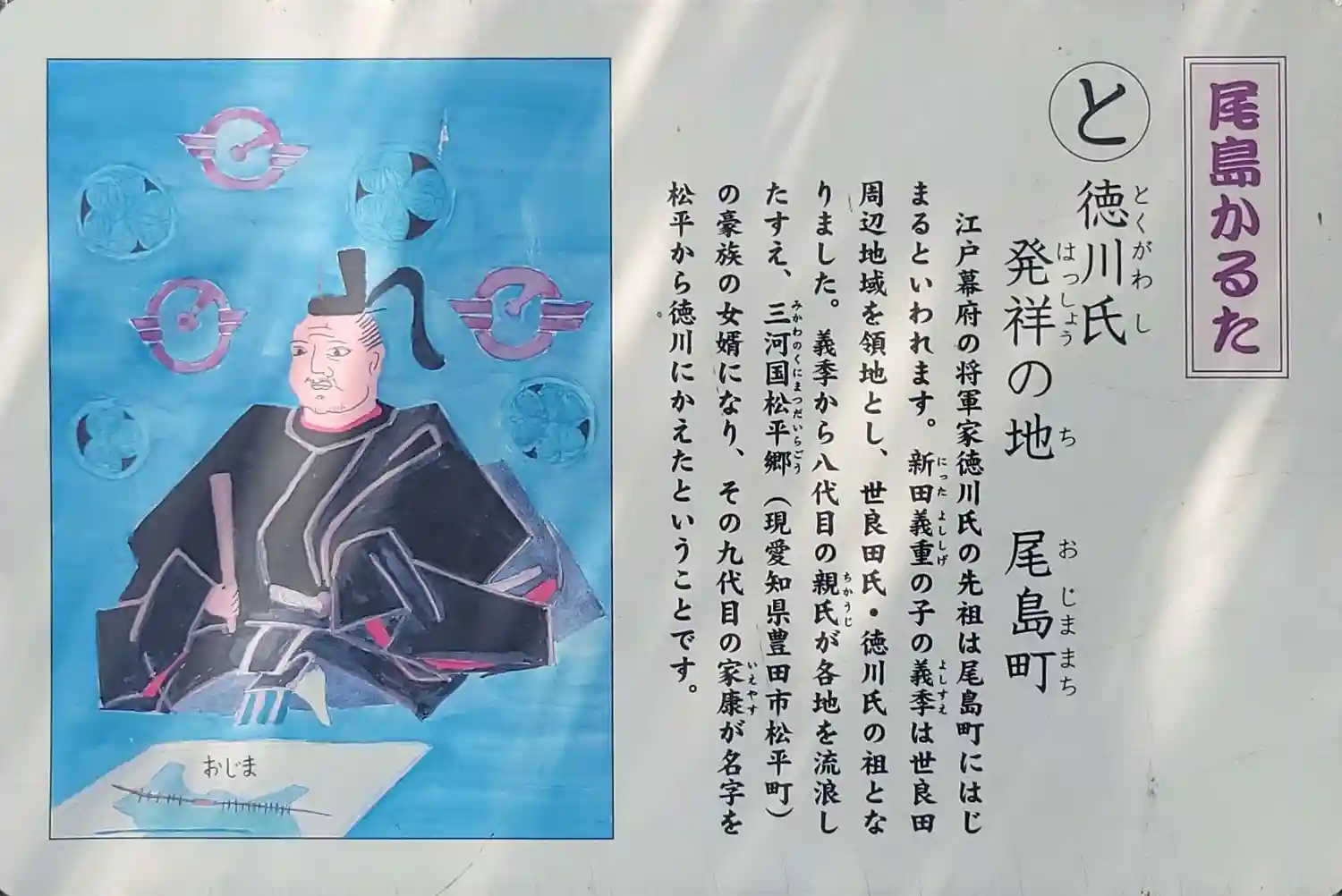 新田義重は、仁安三年 (1168年) に世良田などの開拓の地を四男義季に譲りました。新田義季は上野国新田郡世良田荘徳川郷 (現在の群馬県太田市尾島町) に住んで、徳川 (または得川)を称して徳川義季と名乗りました。これが徳川氏発祥の始まりと言われています。