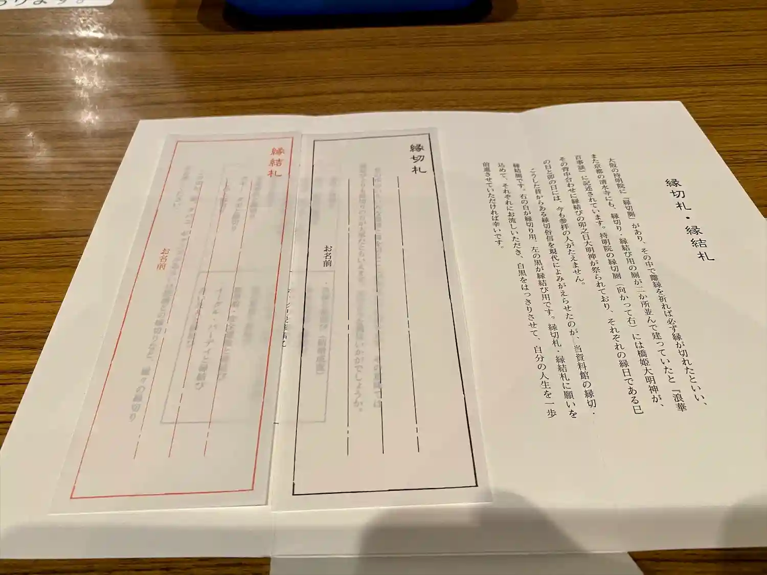 受付で縁切のお札と縁結びのお札1セット¥200のお札を購入します。