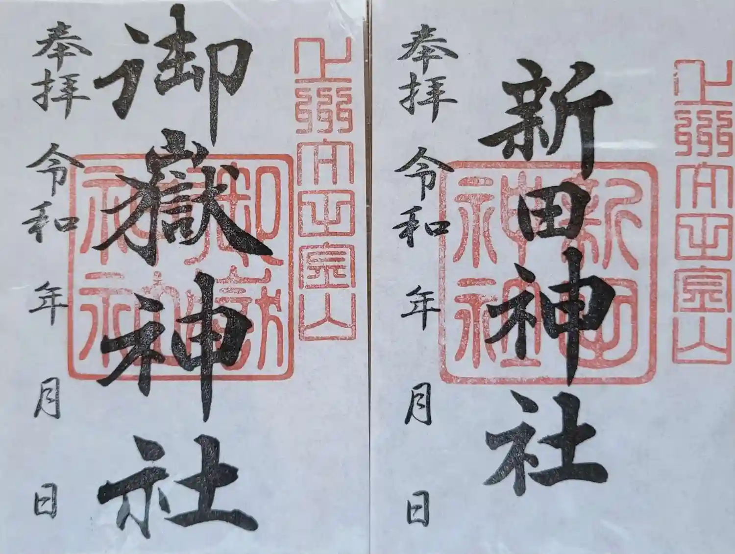 左は山頂の新田神社、右は麓の春日神社にあった書き置き。