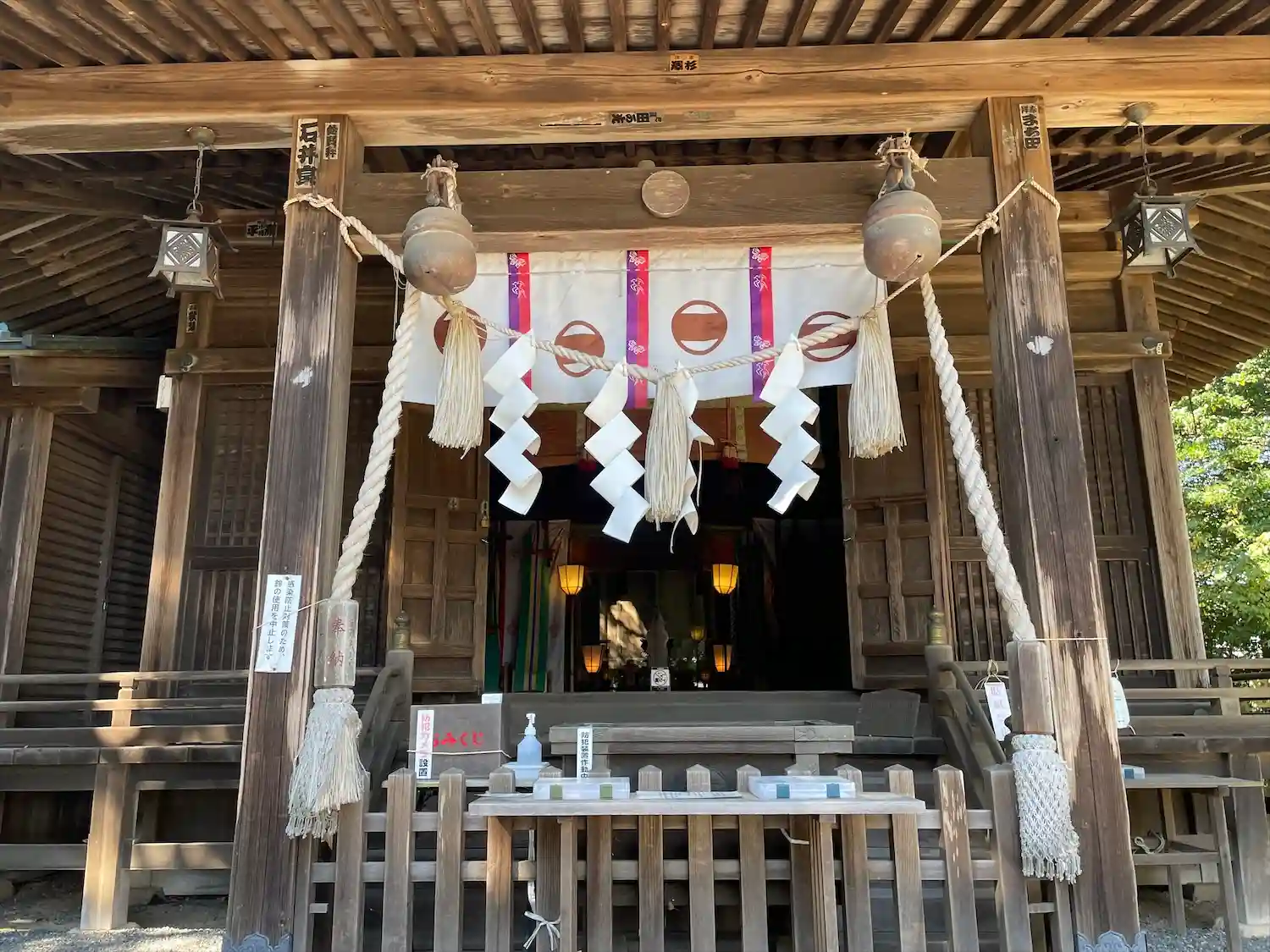 金山城の本丸(山頂)にある。御朱印は拝殿のお賽銭箱の横に置かれ、賽銭箱の中に初穂料を投げ入れて頂くシステム。