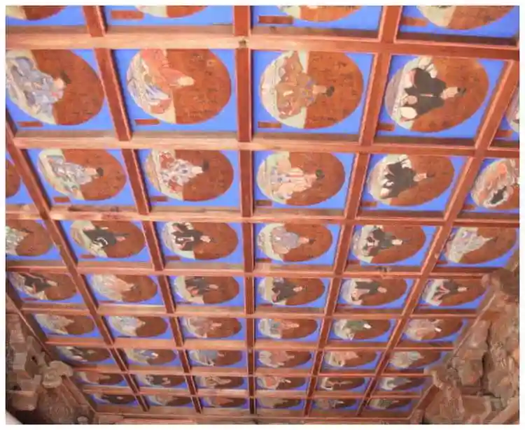 1848念に創建された拝殿に百人一首の歌と詠人の画が描かれた天井画があります