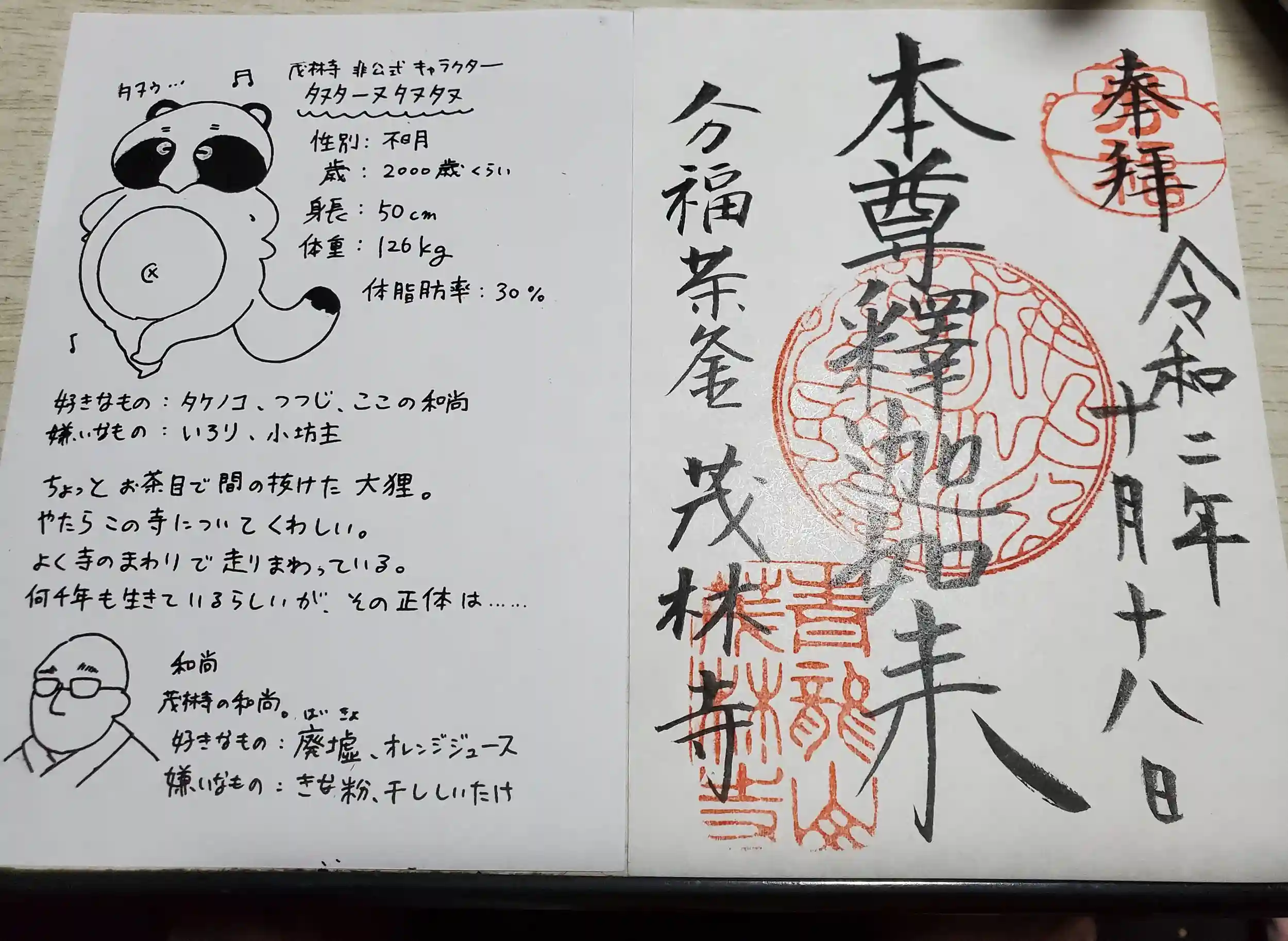 アマビエに化けそこなったユニークなタヌキの御札ももらったので、御朱印帳の同じページに貼ろうかと思います。