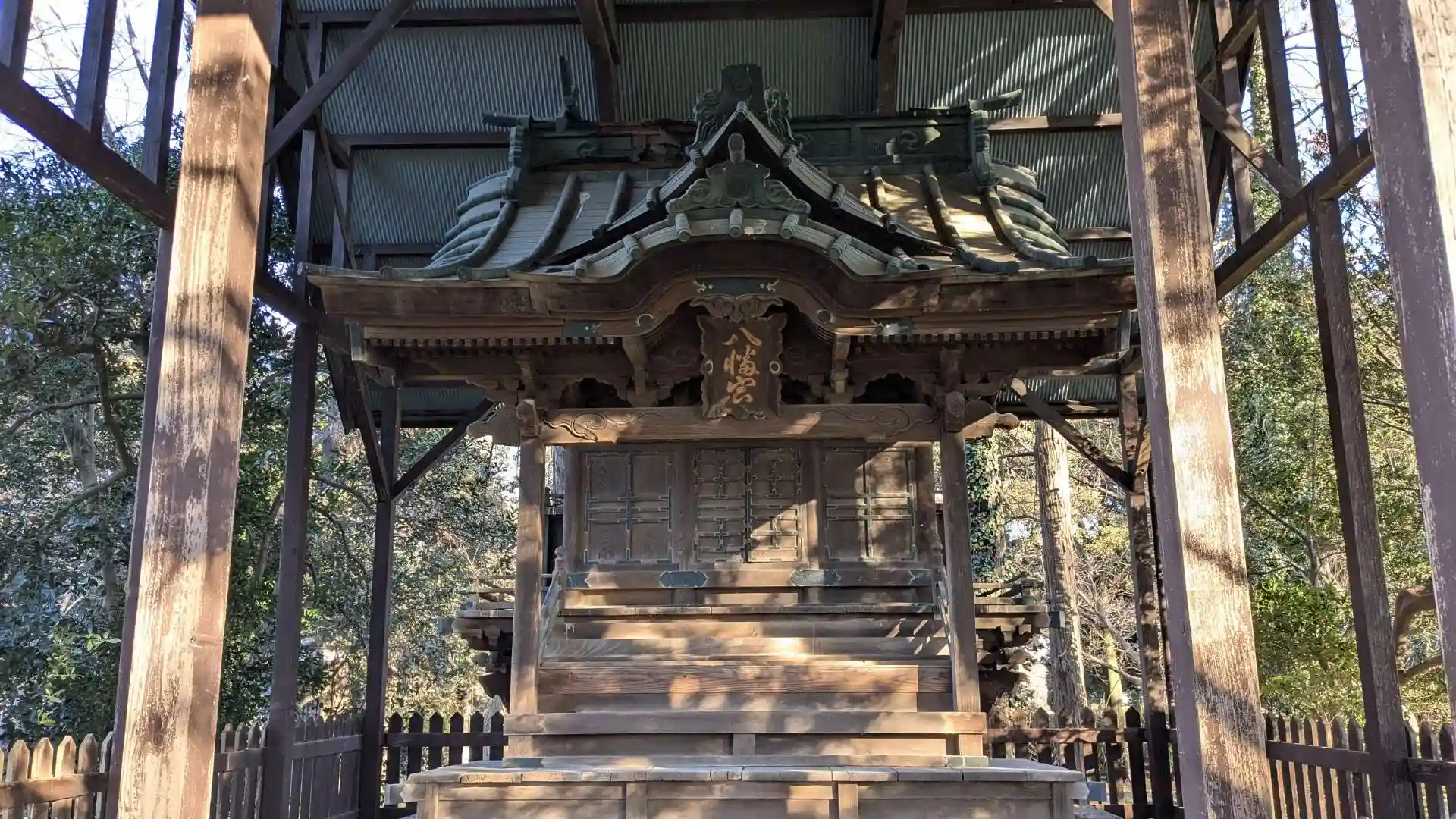 雨よけのトタン屋根の下に社殿があります。